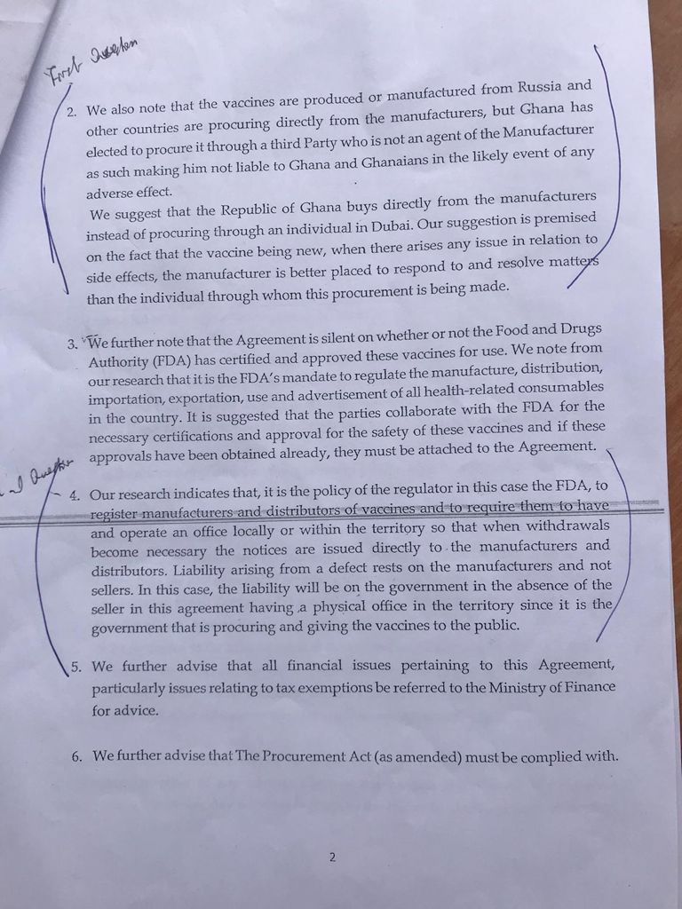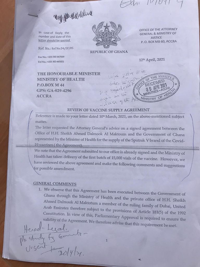 It has emerged that the Attorney General recommended to the Ministry of Health that the procurement of the Sputnik V vaccine be done directly from the Russian manufacturers instead of through an intermediary.