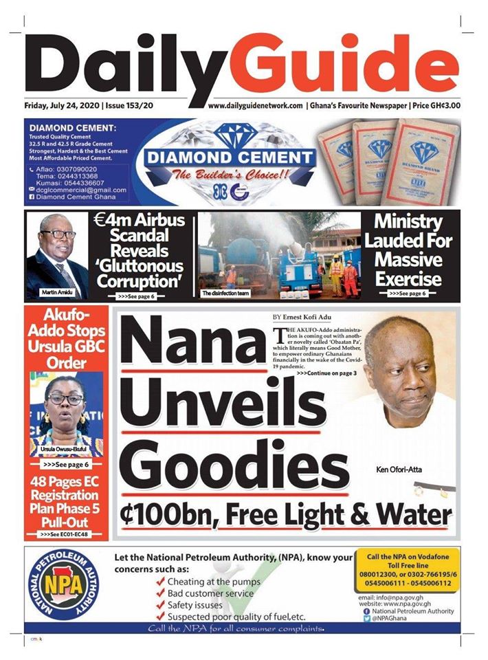 Newspapers Friday, July 24, 2020 Newspaper Headlines By: Editor Date: July 24, 2020 TagsFRONT PAGENews Previous articleGhana’s debt stock rises to GHS255.7 billionNext articleBawumia to open 100-bed Infectious Disease Centre at Ga East today Editor Share post: FacebookTwitterPinterestWhatsApp SubscribeI want inI've read and accept the Privacy Policy. Popular Former Senegalese president joins UN Secretary-General contest. Manchester United midfielder set to follow Casemiro out of the club amid transfer interest from Serie A. Cavan Sullivan is expected to leave Manchester City immediately on a two-year European loan as a former USMNT great urges patience with the MLS... Portugal captain Ronaldo sent an ominous seven-word warning by Colombia icon ahead of the 2026 World Cup encounter. Economist calls for resources to push 24-hour economy implementation Western Region NRSA intensifies campaign on road safety Editor - March 4, 2026 The Western Regional Office of the National Road Safety... Three factions in Nkwanta South hold peace dialogue Editor - March 4, 2026 The National Peace Council has organised a dialogue meeting... Get involved in local governance to improve development and accountability – Mr Awal Editor - March 4, 2026 Mr Mohammed Awal, the Project Lead of Ghana Centre... Ketu South: NDC Youth organiser to contest constituency chairmanship position Editor - March 4, 2026 Mr Elolo White Kelie, the former youth Organiser of... More like thisRelated