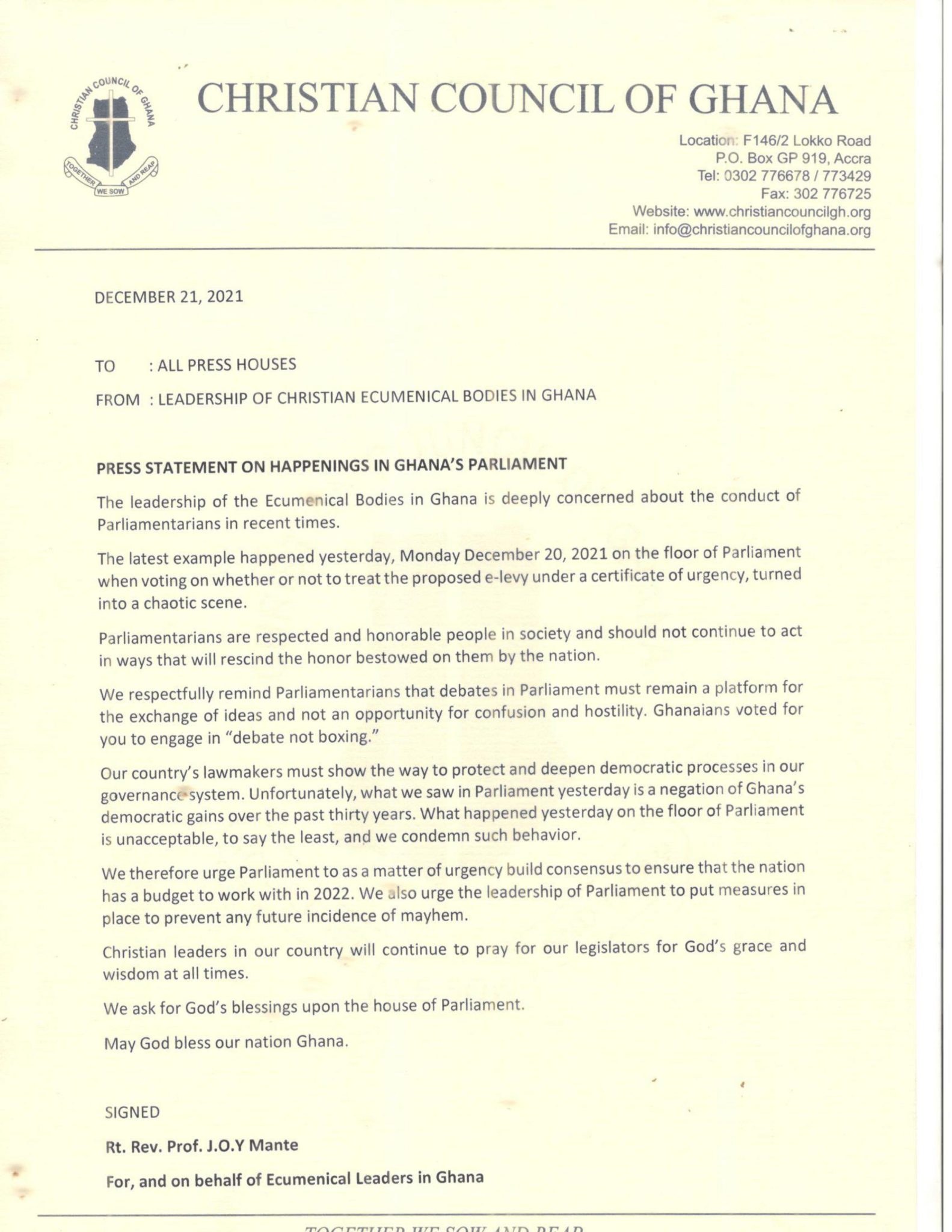 The Christian Council of Ghana wants parliament to take urgent steps towards building consensus on the 2022 budget and ensure that steps are taken to prevent chaos in Parliament in future.
