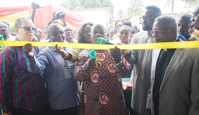 Mr Kwaku Agyeman-Manu(third from right),being assisted by Dr Anthony Nsiah Asare,Director-General,GHS to cut the tape to commission the Oduman Polyclinic.