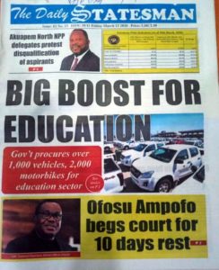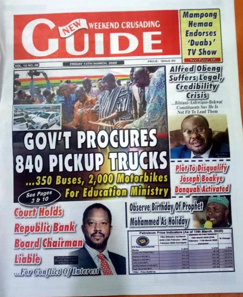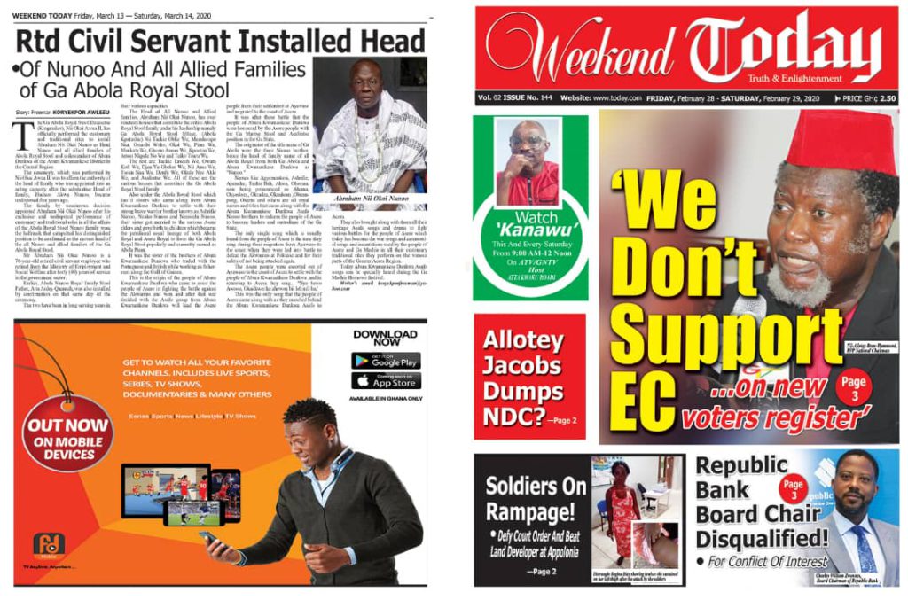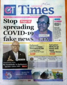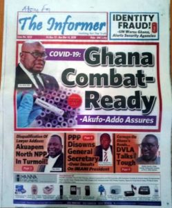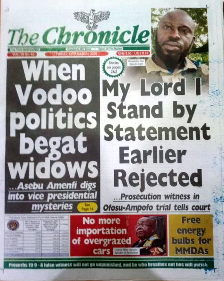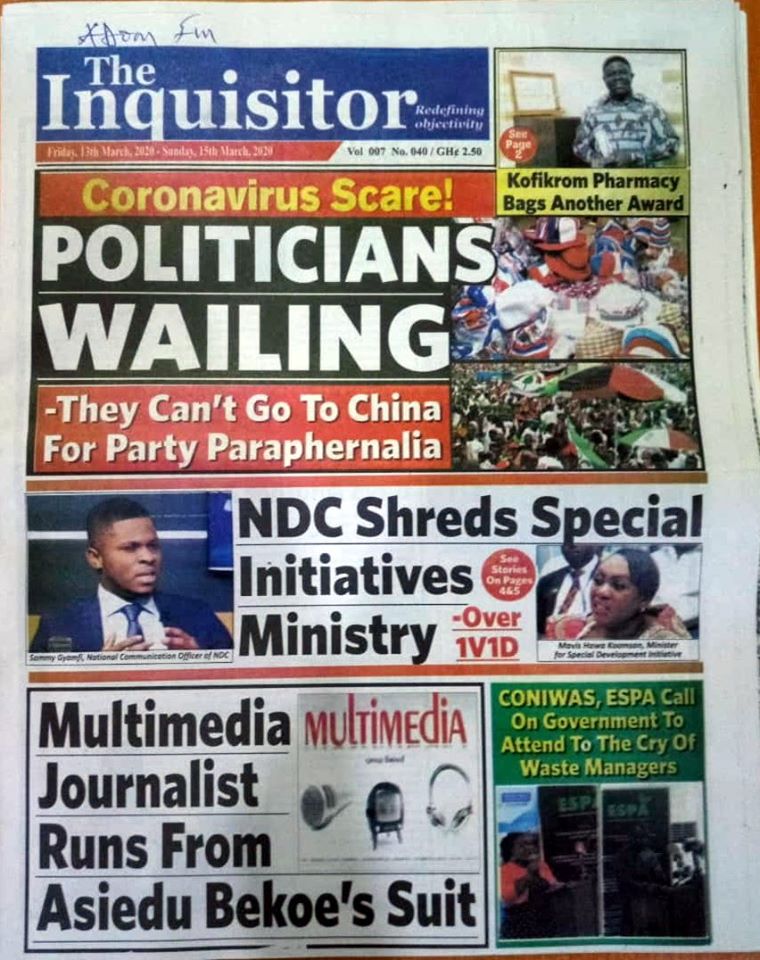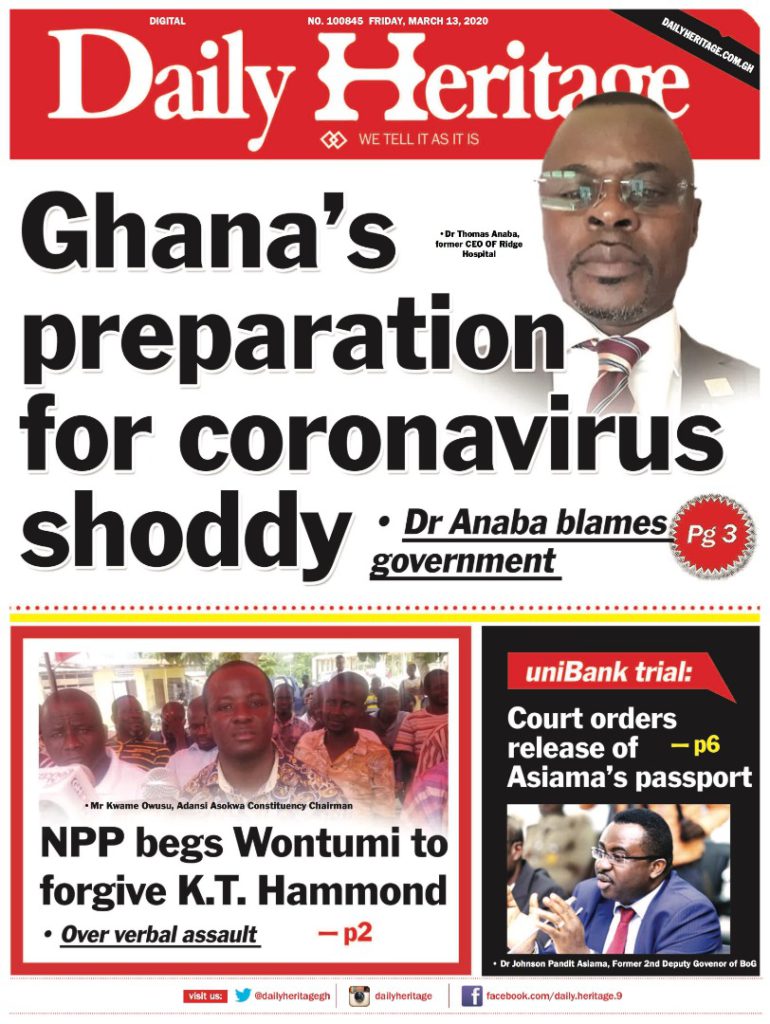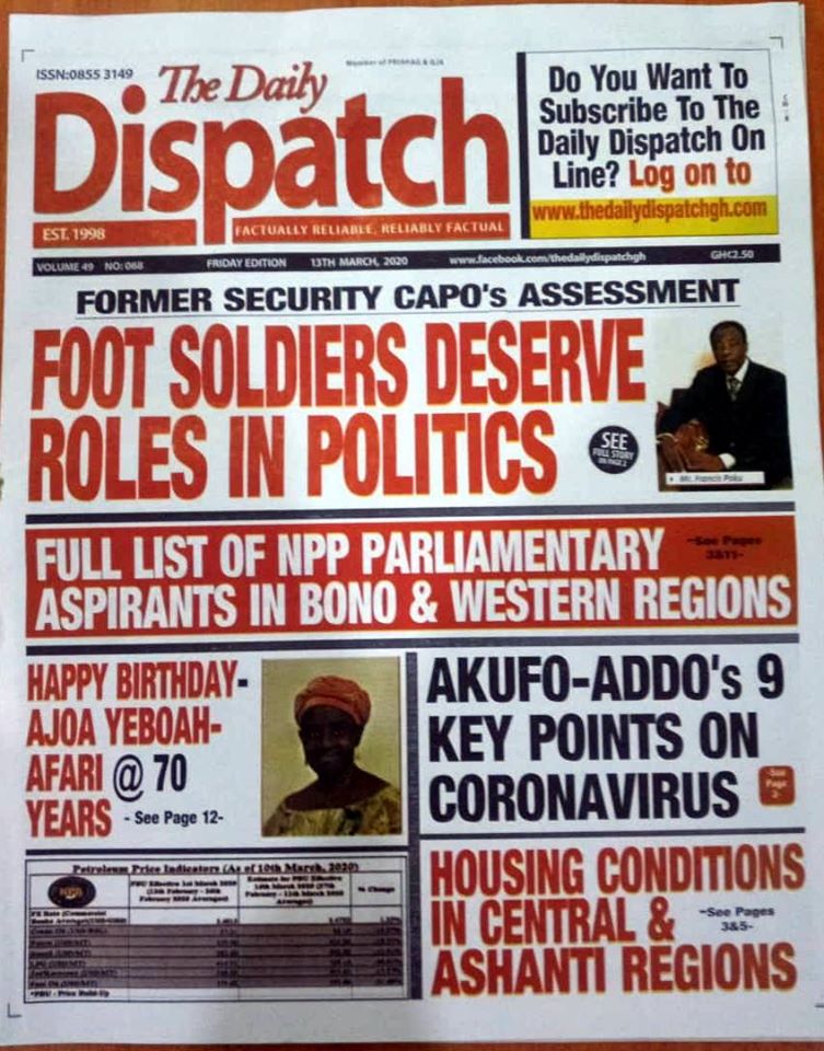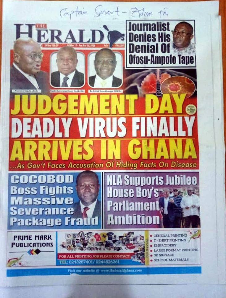 Newspapers Newspaper Headlines Friday 13th March 2020 By: Editor Date: March 13, 2020 Newspaper Headlines Friday 13th March 2020 TagsNewspaper HeadlinesNewspaper Headlines Friday 13th March 2020 Previous articleWHO characterizes COVID-19 as a pandemicNext articleHow to Help Your Teens Overcome Their Coronavirus Fear Editor Share post: FacebookTwitterPinterestWhatsApp SubscribeI want inI've read and accept the Privacy Policy. Popular France plans to expand its nuclear arsenal and strengthen European weapons cooperation. Demand for Black Stars Jerseys rises ahead of 2026 World Cup Ayawaso-East bye-election sees mixed turnout, smooth voting   2026 SoNA projects economic stability-Political Analyst Get involved in local governance to improve development and accountability – Mr Awal Western Region NRSA intensifies campaign on road safety Editor - March 4, 2026 The Western Regional Office of the National Road Safety... Three factions in Nkwanta South hold peace dialogue Editor - March 4, 2026 The National Peace Council has organised a dialogue meeting... Get involved in local governance to improve development and accountability – Mr Awal Editor - March 4, 2026 Mr Mohammed Awal, the Project Lead of Ghana Centre... Ketu South: NDC Youth organiser to contest constituency chairmanship position Editor - March 4, 2026 Mr Elolo White Kelie, the former youth Organiser of... More like thisRelated