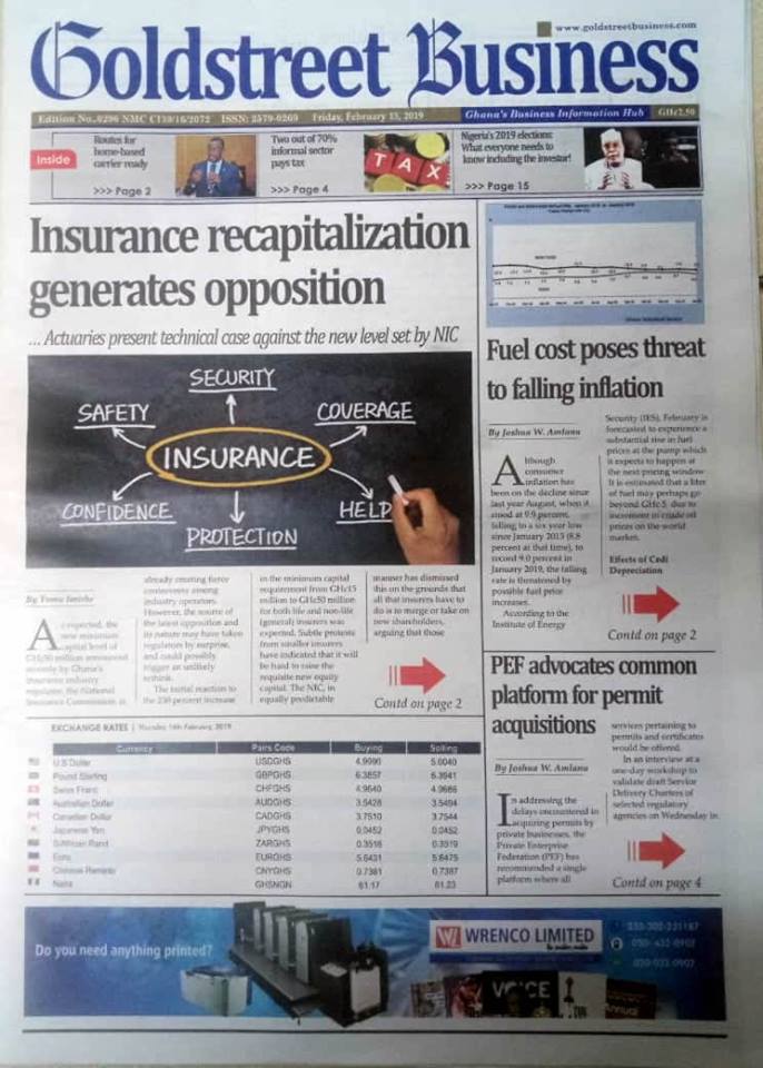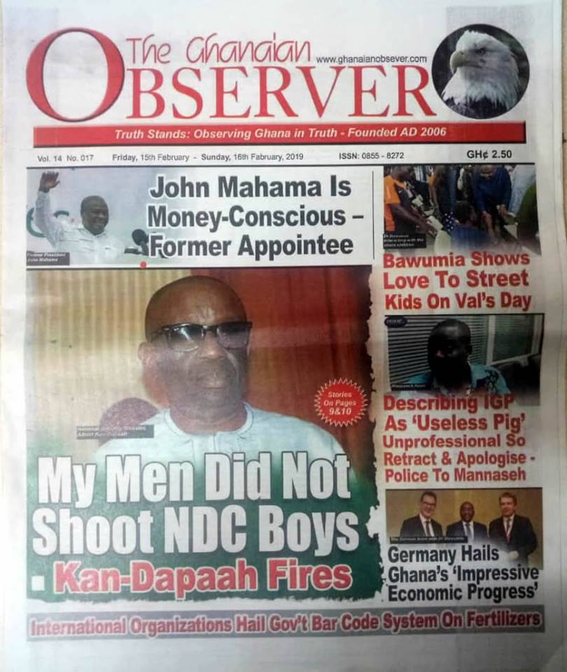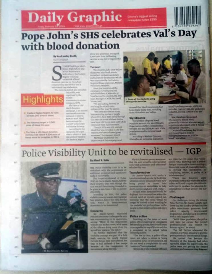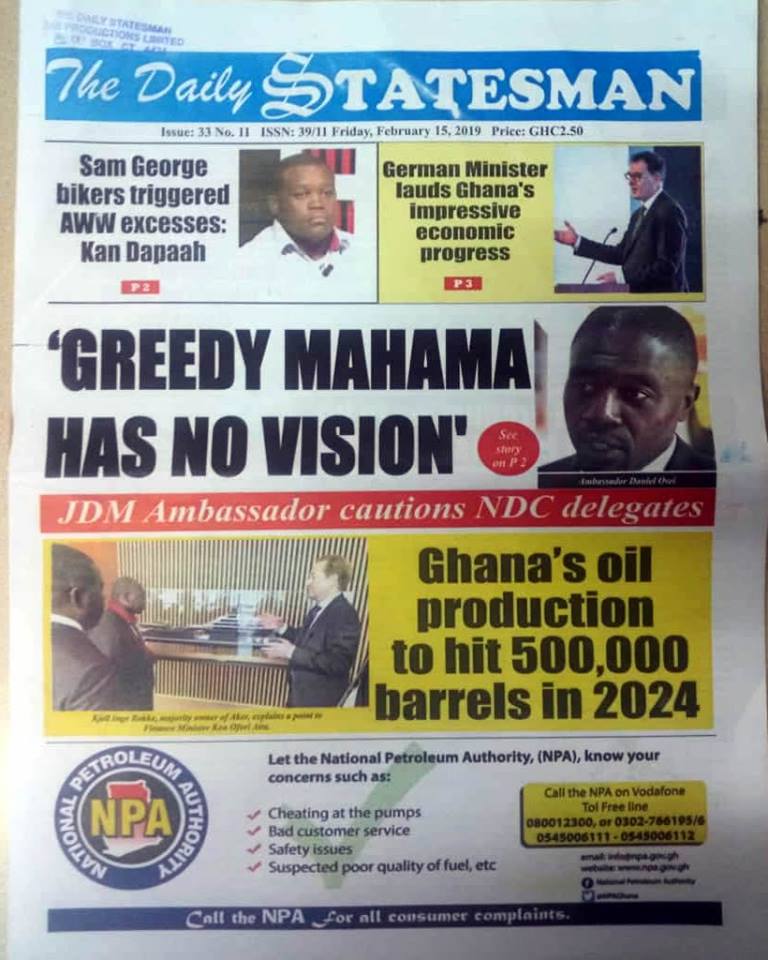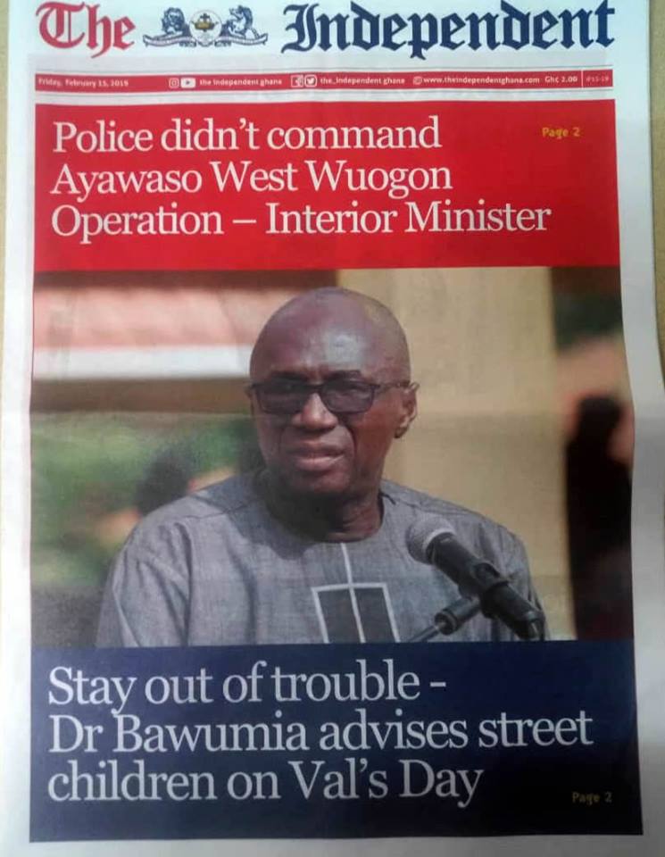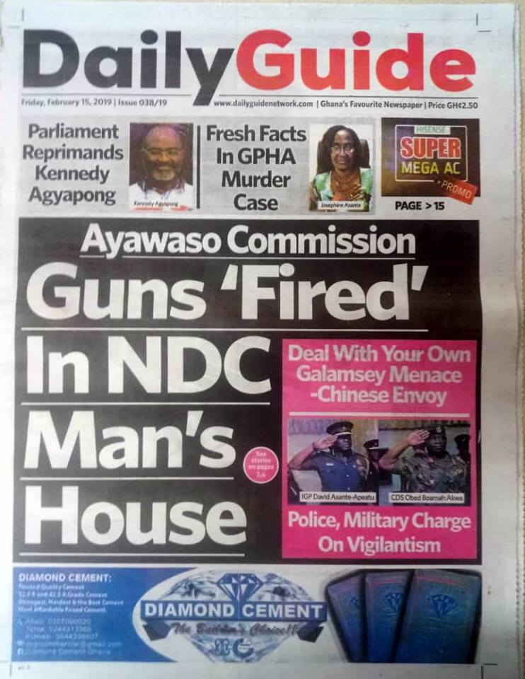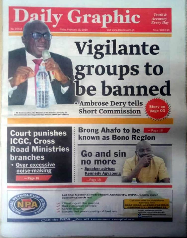 Newspapers Newspaper Headlines: Friday February 15, 2019 By: Editor Date: February 15, 2019 TagsNewspaper HeadlinesNewspapers Previous articleFavourite player’s injured? Get a refundNext article[Kenya] Rose Ogega joins Safaricom Board Editor Share post: FacebookTwitterPinterestWhatsApp SubscribeI want inI've read and accept the Privacy Policy. Popular The Israeli army issued new evacuation advisories in Lebanon. France plans to expand its nuclear arsenal and strengthen European weapons cooperation. Cavan Sullivan is expected to leave Manchester City immediately on a two-year European loan as a former USMNT great urges patience with the MLS... Western Region NRSA intensifies campaign on road safety Pep Guardiola provides an updated report on Erling Haaland’s injury as Manchester City awaits the star striker’s fitness for the Nottingham Forest match. Western Region NRSA intensifies campaign on road safety Editor - March 4, 2026 The Western Regional Office of the National Road Safety... Three factions in Nkwanta South hold peace dialogue Editor - March 4, 2026 The National Peace Council has organised a dialogue meeting... Get involved in local governance to improve development and accountability – Mr Awal Editor - March 4, 2026 Mr Mohammed Awal, the Project Lead of Ghana Centre... Ketu South: NDC Youth organiser to contest constituency chairmanship position Editor - March 4, 2026 Mr Elolo White Kelie, the former youth Organiser of... More like thisRelated