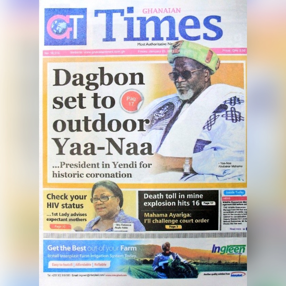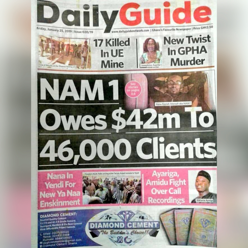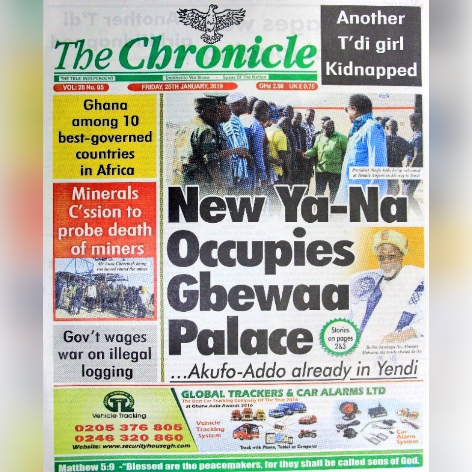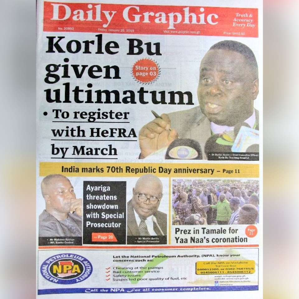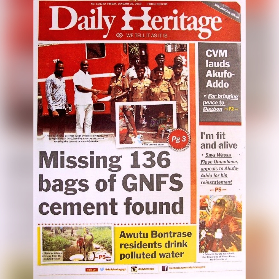 Newspapers Newspaper headlines: Friday, January 25, 2019 By: Editor Date: January 25, 2019 Previous articleNewspaper headlines: Thursday, January 24, 2019Next articlePresident Akufo-Addo Congratulates President Tshisekedi Of DRC Editor Share post: FacebookTwitterPinterestWhatsApp SubscribeI want inI've read and accept the Privacy Policy. Popular Demand for Black Stars Jerseys rises ahead of 2026 World Cup CDD-Ghana engages stakeholders on proposed law to curb political monetisation President Mahama holds bilateral meeting with Tanzanian counterpart Economist calls for resources to push 24-hour economy implementation Oil prices jump as Iran threatens to strike ships in the Strait of Hormuz. Western Region NRSA intensifies campaign on road safety Editor - March 4, 2026 The Western Regional Office of the National Road Safety... Three factions in Nkwanta South hold peace dialogue Editor - March 4, 2026 The National Peace Council has organised a dialogue meeting... Get involved in local governance to improve development and accountability – Mr Awal Editor - March 4, 2026 Mr Mohammed Awal, the Project Lead of Ghana Centre... Ketu South: NDC Youth organiser to contest constituency chairmanship position Editor - March 4, 2026 Mr Elolo White Kelie, the former youth Organiser of... More like thisRelated