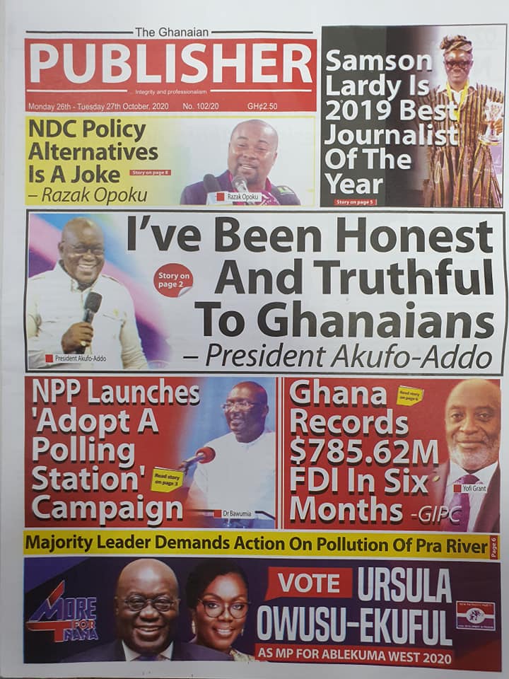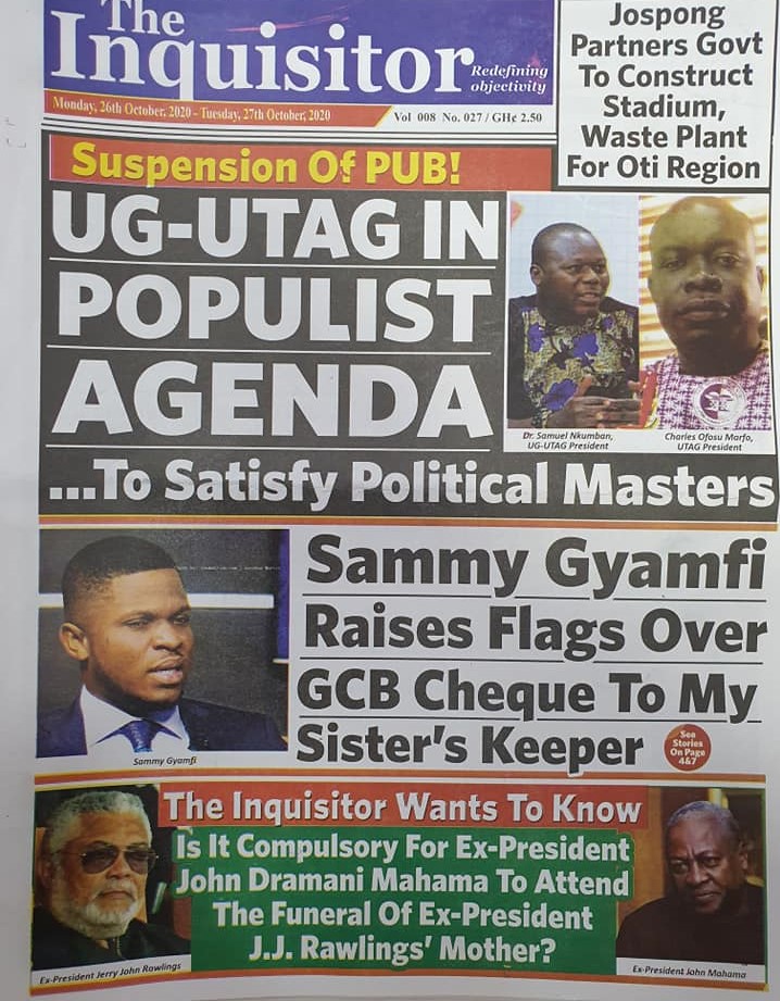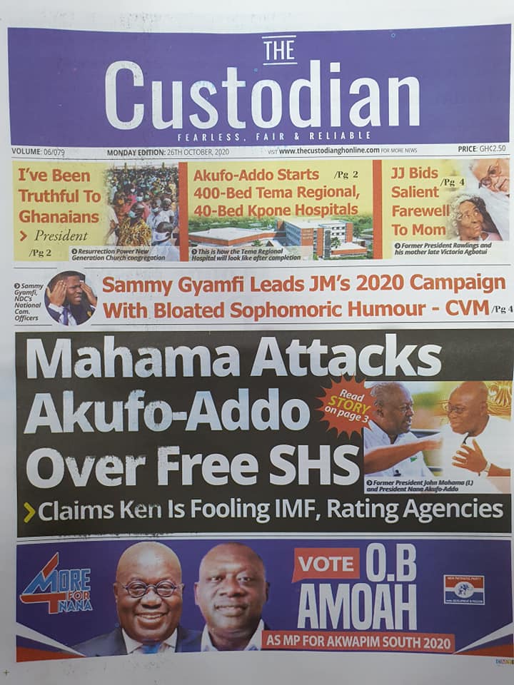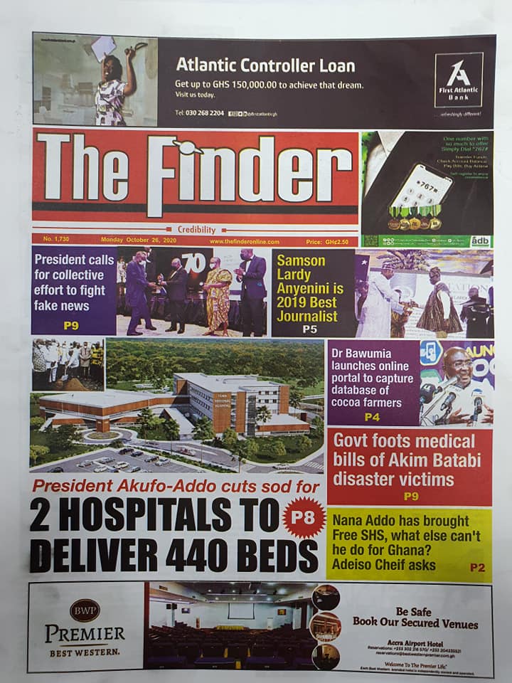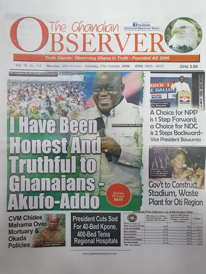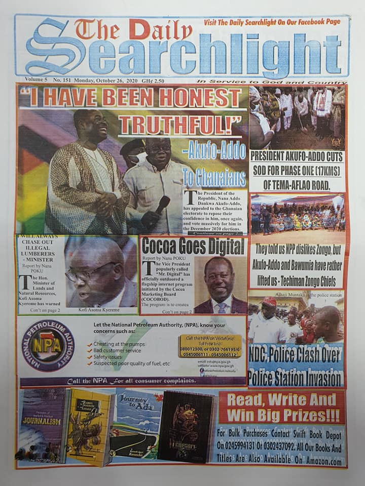 Newspapers Newspaper Headlines Monday 26th October 2020 By: Editor Date: October 26, 2020 Newspaper Headlines Monday 26th October 2020 TagsNewspaper HeadlinesNewspapers Previous articleNewspaper Headlines Friday 23rd October 2020Next articleNewspaper Headlines Tuesday 27th October 2020 Editor Share post: FacebookTwitterPinterestWhatsApp SubscribeI want inI've read and accept the Privacy Policy. Popular Western Region NRSA intensifies campaign on road safety Demand for Black Stars Jerseys rises ahead of 2026 World Cup President Mahama calls for cessation of United States/Israel and Iran conflict  Government reviews decentralisation reforms, commits to local development The Israeli army issued new evacuation advisories in Lebanon. Western Region NRSA intensifies campaign on road safety Editor - March 4, 2026 The Western Regional Office of the National Road Safety... Three factions in Nkwanta South hold peace dialogue Editor - March 4, 2026 The National Peace Council has organised a dialogue meeting... Get involved in local governance to improve development and accountability – Mr Awal Editor - March 4, 2026 Mr Mohammed Awal, the Project Lead of Ghana Centre... Ketu South: NDC Youth organiser to contest constituency chairmanship position Editor - March 4, 2026 Mr Elolo White Kelie, the former youth Organiser of... More like thisRelated