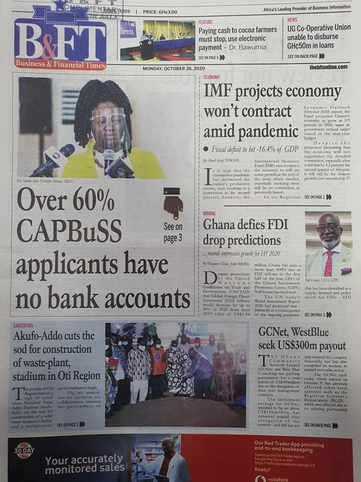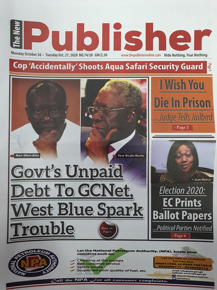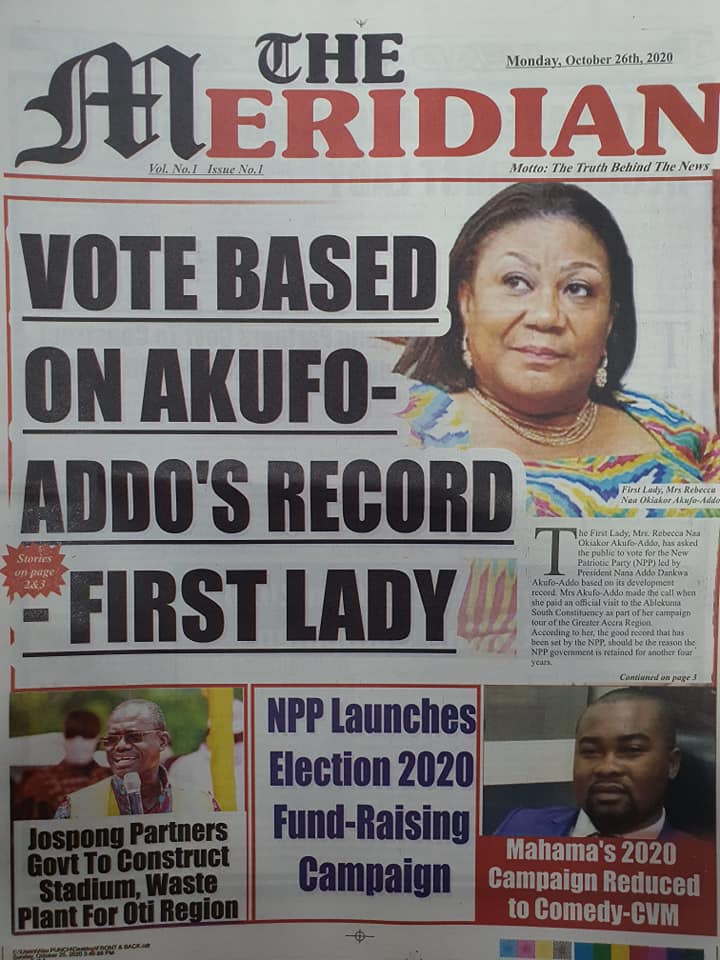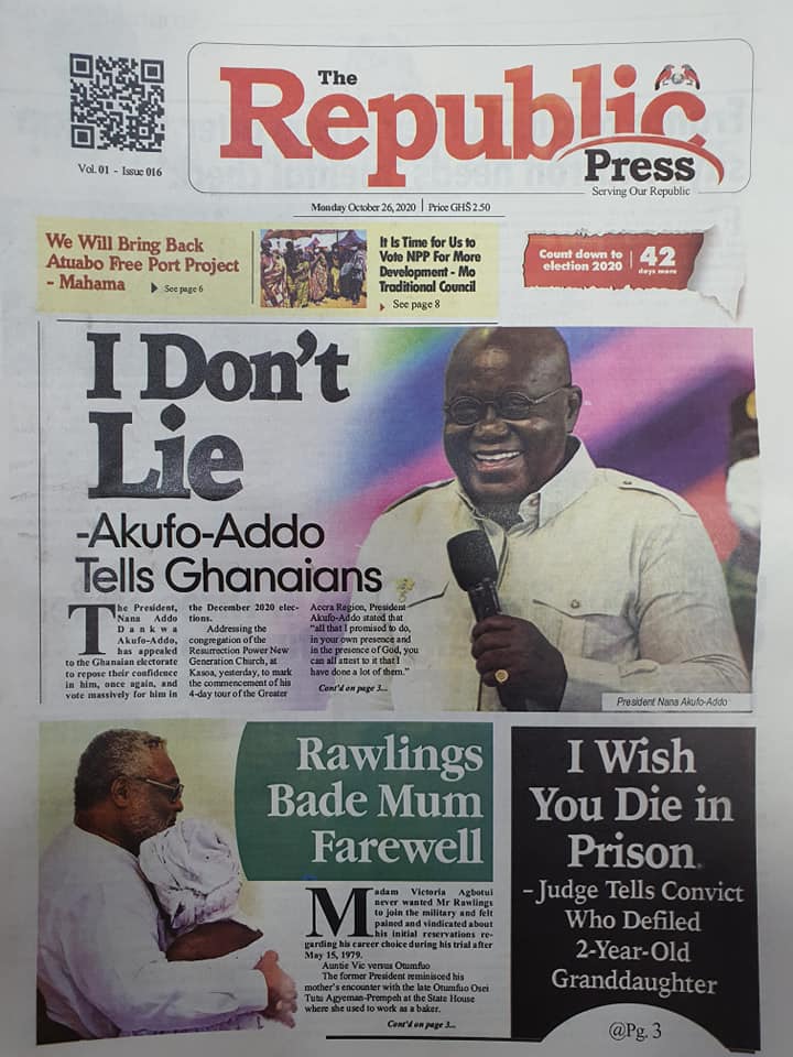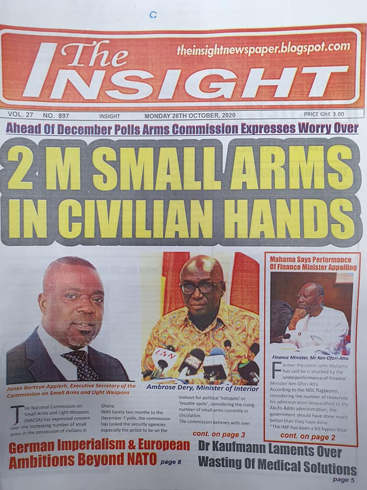 Newspapers Newspaper Headlines Monday 26th October 2020 By: Editor Date: October 26, 2020 Newspaper Headlines Monday 26th October 2020 TagsNewspaper HeadlinesNewspapers Previous articleNewspaper Headlines Friday 23rd October 2020Next articleNewspaper Headlines Tuesday 27th October 2020 Editor Share post: FacebookTwitterPinterestWhatsApp SubscribeI want inI've read and accept the Privacy Policy. Popular Western Region NRSA intensifies campaign on road safety Demand for Black Stars Jerseys rises ahead of 2026 World Cup President Mahama calls for cessation of United States/Israel and Iran conflict  Government reviews decentralisation reforms, commits to local development The Israeli army issued new evacuation advisories in Lebanon. Western Region NRSA intensifies campaign on road safety Editor - March 4, 2026 The Western Regional Office of the National Road Safety... Three factions in Nkwanta South hold peace dialogue Editor - March 4, 2026 The National Peace Council has organised a dialogue meeting... Get involved in local governance to improve development and accountability – Mr Awal Editor - March 4, 2026 Mr Mohammed Awal, the Project Lead of Ghana Centre... Ketu South: NDC Youth organiser to contest constituency chairmanship position Editor - March 4, 2026 Mr Elolo White Kelie, the former youth Organiser of... More like thisRelated
