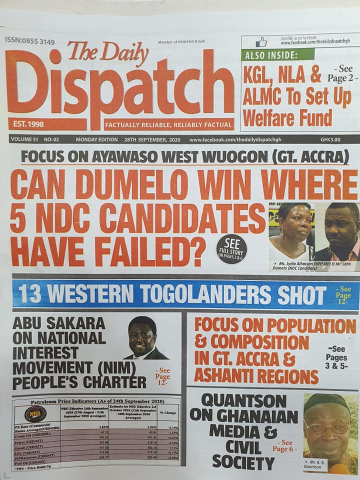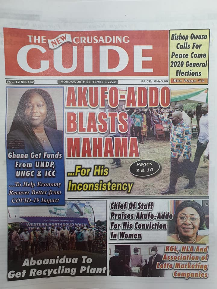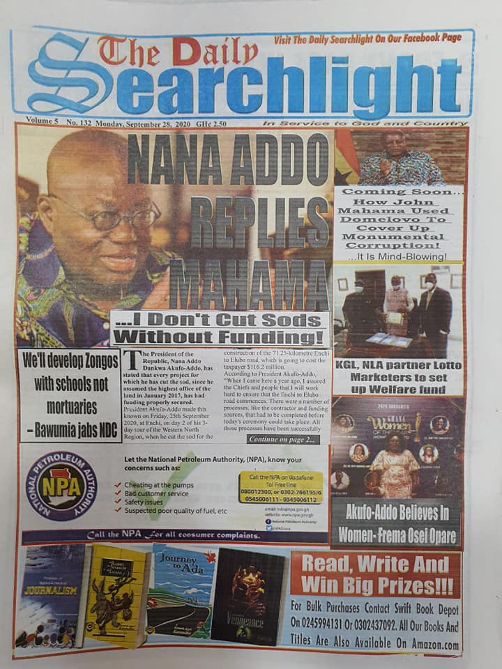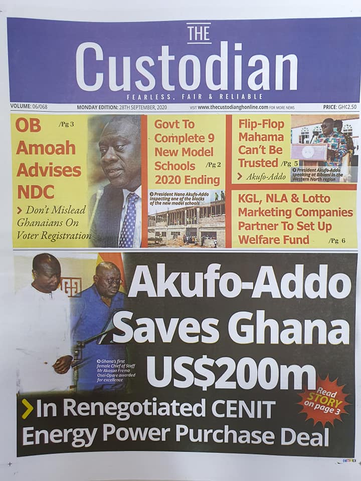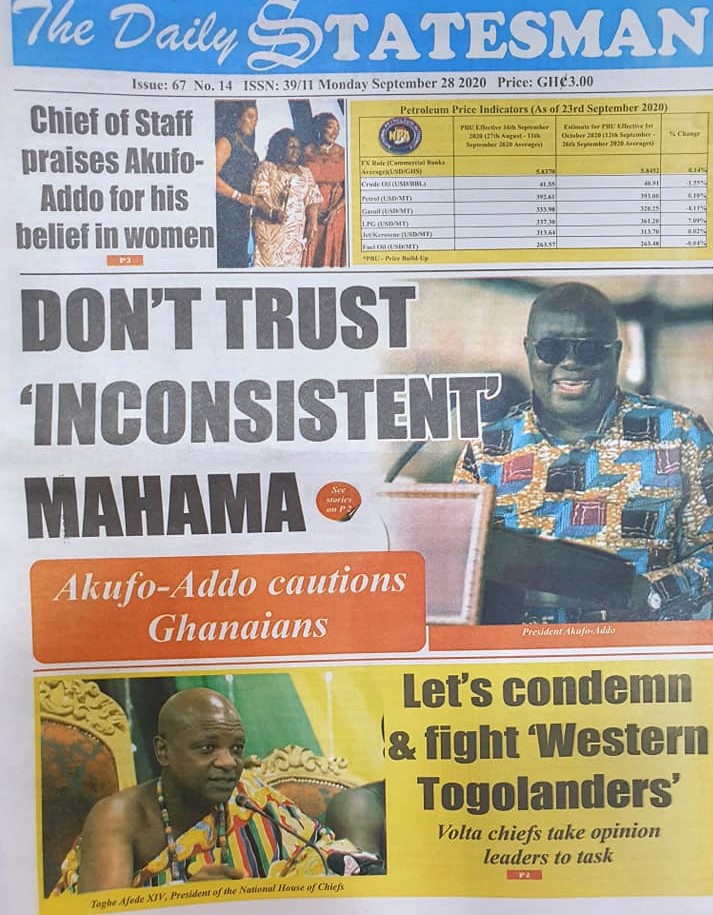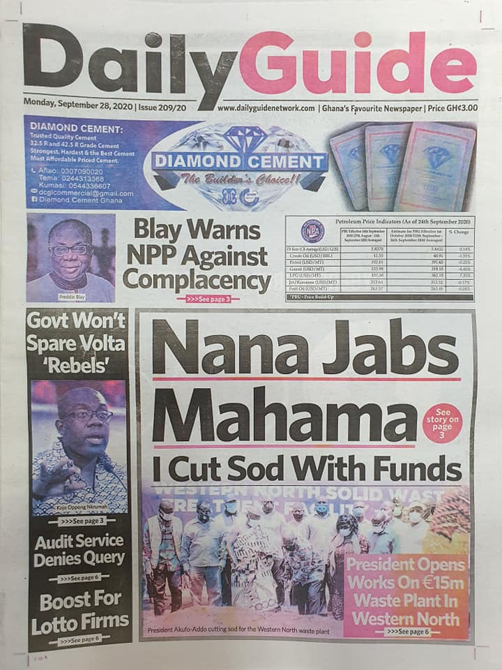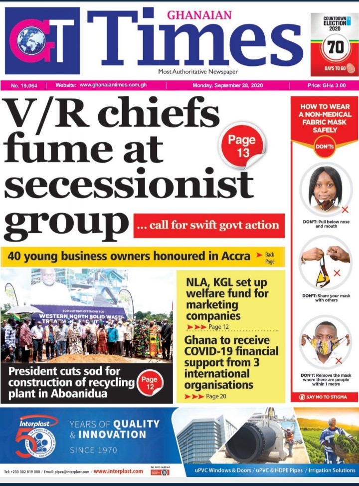 Newspapers Newspaper Headlines Monday, 28th September, 2020 By: Editor Date: September 28, 2020 TagsNewspaperNewspaper Headlines Previous articleNewspaper Headlines Wednesday 23rd September 2020Next articleGovernment releases incentive packages to partners in Tourism Industry-Minister. Editor Share post: FacebookTwitterPinterestWhatsApp SubscribeI want inI've read and accept the Privacy Policy. Popular The United States slaps sanctions on Rwanda’s military over violence in the Democratic Republic of Congo. Zimbabwe releases more than 4,000 inmates under presidential amnesty. Three factions in Nkwanta South hold peace dialogue Pep Guardiola provides an updated report on Erling Haaland’s injury as Manchester City awaits the star striker’s fitness for the Nottingham Forest match. Former Senegalese president joins UN Secretary-General contest. Western Region NRSA intensifies campaign on road safety Editor - March 4, 2026 The Western Regional Office of the National Road Safety... Three factions in Nkwanta South hold peace dialogue Editor - March 4, 2026 The National Peace Council has organised a dialogue meeting... Get involved in local governance to improve development and accountability – Mr Awal Editor - March 4, 2026 Mr Mohammed Awal, the Project Lead of Ghana Centre... Ketu South: NDC Youth organiser to contest constituency chairmanship position Editor - March 4, 2026 Mr Elolo White Kelie, the former youth Organiser of... More like thisRelated