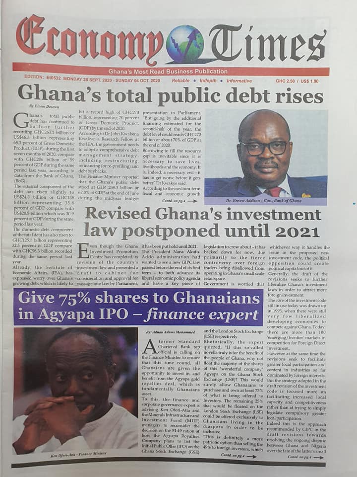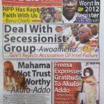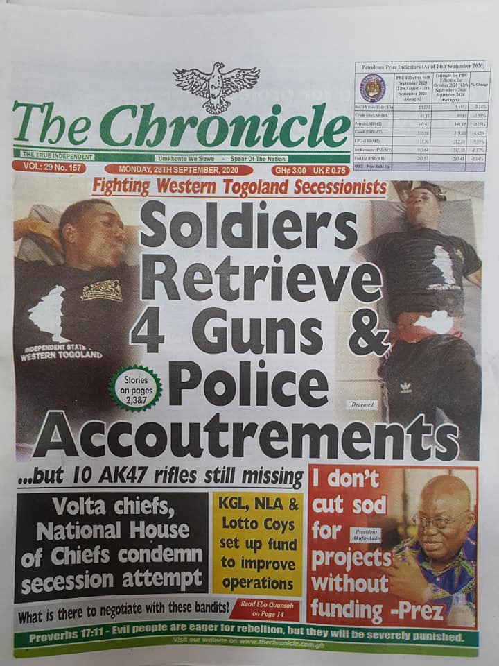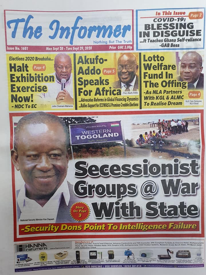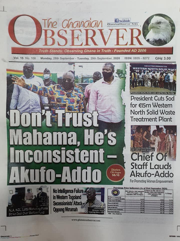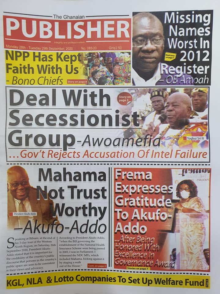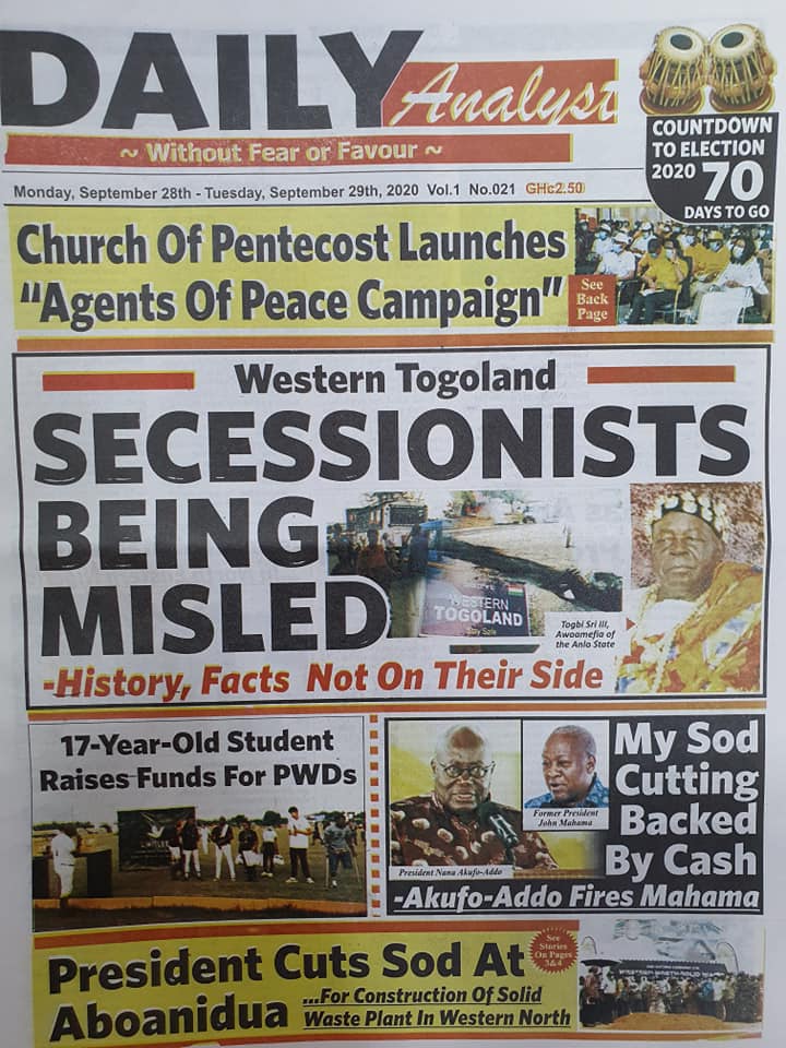 Newspapers Newspaper Headlines Monday, 28th September, 2020 By: Editor Date: September 28, 2020 TagsNewspaperNewspaper Headlines Previous articleNewspaper Headlines Wednesday 23rd September 2020Next articleGovernment releases incentive packages to partners in Tourism Industry-Minister. Editor Share post: FacebookTwitterPinterestWhatsApp SubscribeI want inI've read and accept the Privacy Policy. Popular The United States slaps sanctions on Rwanda’s military over violence in the Democratic Republic of Congo. Zimbabwe releases more than 4,000 inmates under presidential amnesty. Three factions in Nkwanta South hold peace dialogue Pep Guardiola provides an updated report on Erling Haaland’s injury as Manchester City awaits the star striker’s fitness for the Nottingham Forest match. Former Senegalese president joins UN Secretary-General contest. Western Region NRSA intensifies campaign on road safety Editor - March 4, 2026 The Western Regional Office of the National Road Safety... Three factions in Nkwanta South hold peace dialogue Editor - March 4, 2026 The National Peace Council has organised a dialogue meeting... Get involved in local governance to improve development and accountability – Mr Awal Editor - March 4, 2026 Mr Mohammed Awal, the Project Lead of Ghana Centre... Ketu South: NDC Youth organiser to contest constituency chairmanship position Editor - March 4, 2026 Mr Elolo White Kelie, the former youth Organiser of... More like thisRelated