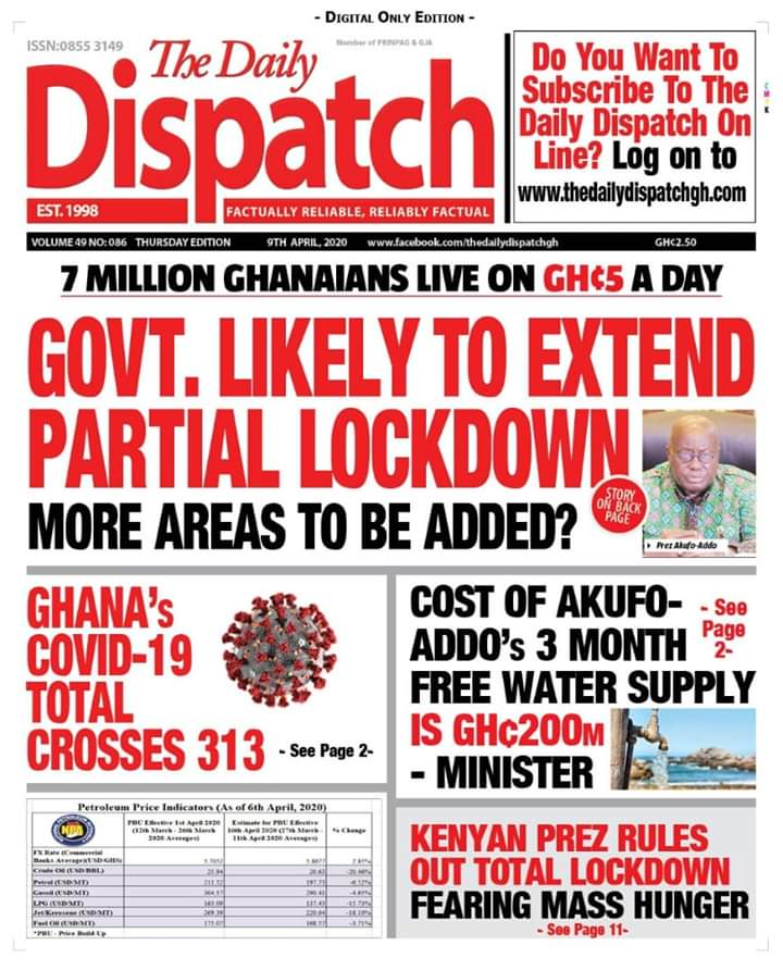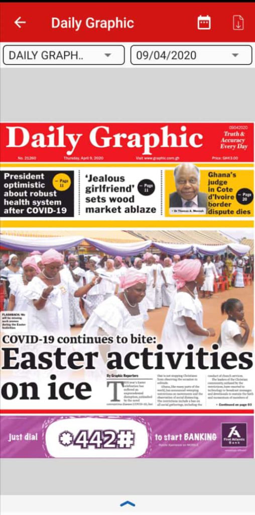 Newspapers Newspaper Headlines Thursday 9th April 2020 By: Editor Date: April 9, 2020 Newspaper Headlines Thursday 9th April 2020 TagsNewspaper HeadlinesNewspaper Headlines Thursday 9th April 2020 Previous articleInstitutions in Tema must help fight COVID-19, MCENext articleHonorary Consular Corps in Ghana donates equipment to security services Editor Share post: FacebookTwitterPinterestWhatsApp SubscribeI want inI've read and accept the Privacy Policy. Popular 2026 SoNA projects economic stability-Political Analyst President Mahama calls for cessation of United States/Israel and Iran conflict  Economist calls for resources to push 24-hour economy implementation Demand for Black Stars Jerseys rises ahead of 2026 World Cup The Israeli army issued new evacuation advisories in Lebanon. Western Region NRSA intensifies campaign on road safety Editor - March 4, 2026 The Western Regional Office of the National Road Safety... Three factions in Nkwanta South hold peace dialogue Editor - March 4, 2026 The National Peace Council has organised a dialogue meeting... Get involved in local governance to improve development and accountability – Mr Awal Editor - March 4, 2026 Mr Mohammed Awal, the Project Lead of Ghana Centre... Ketu South: NDC Youth organiser to contest constituency chairmanship position Editor - March 4, 2026 Mr Elolo White Kelie, the former youth Organiser of... More like thisRelated