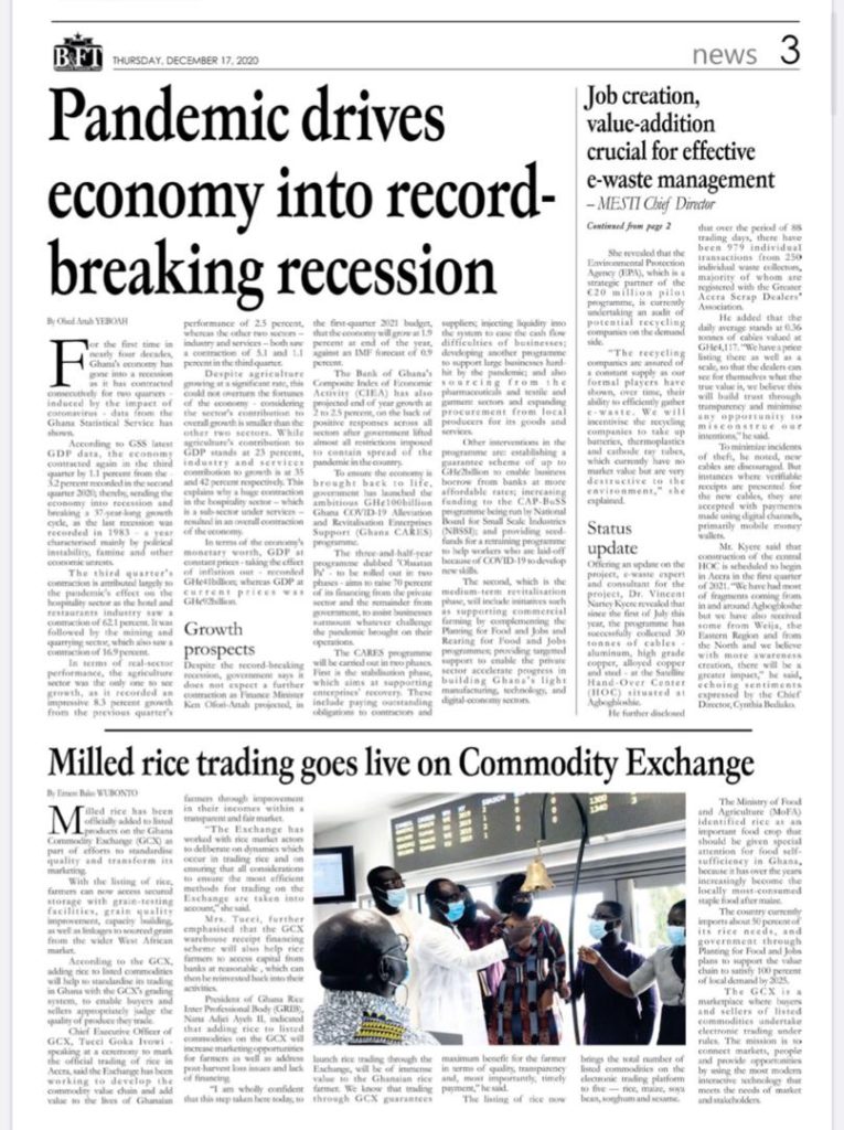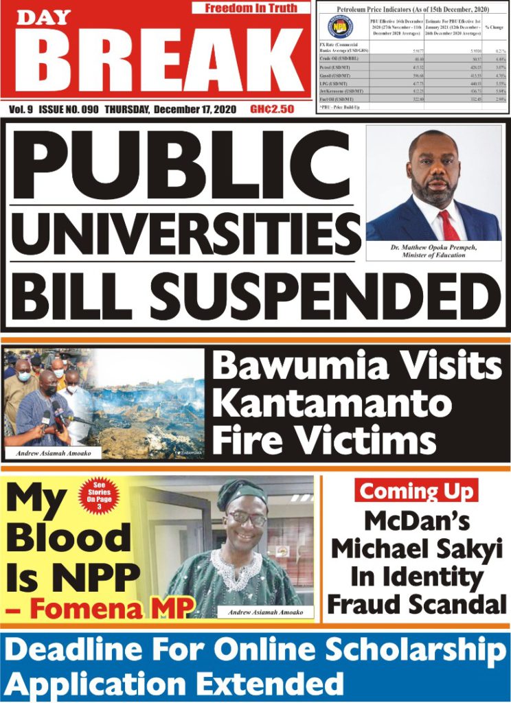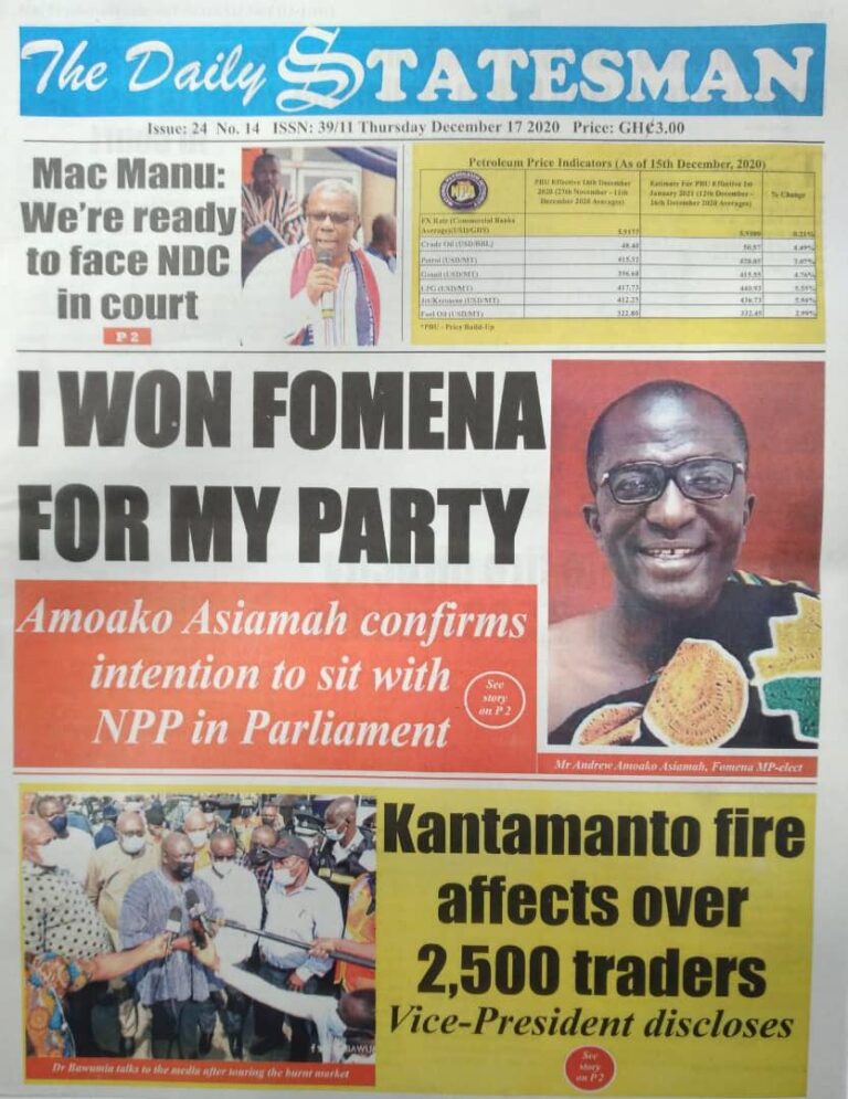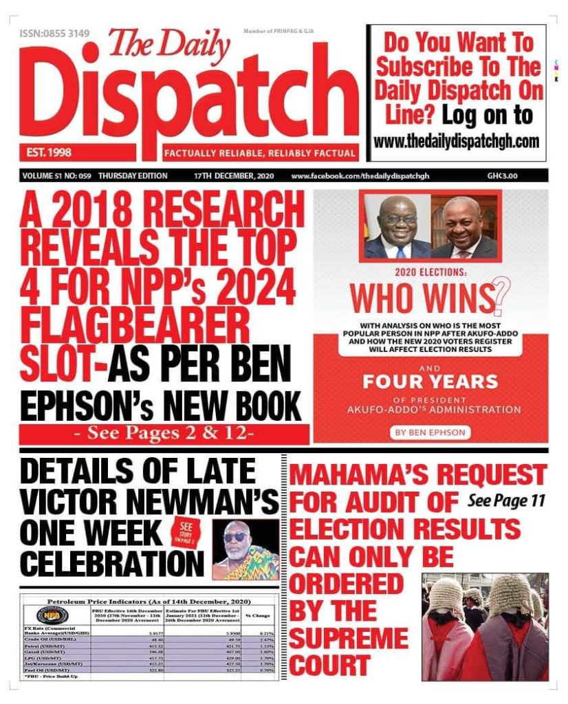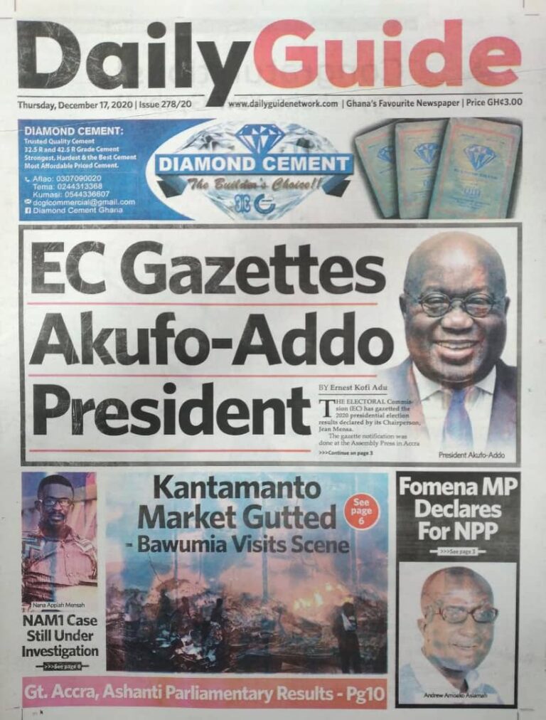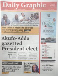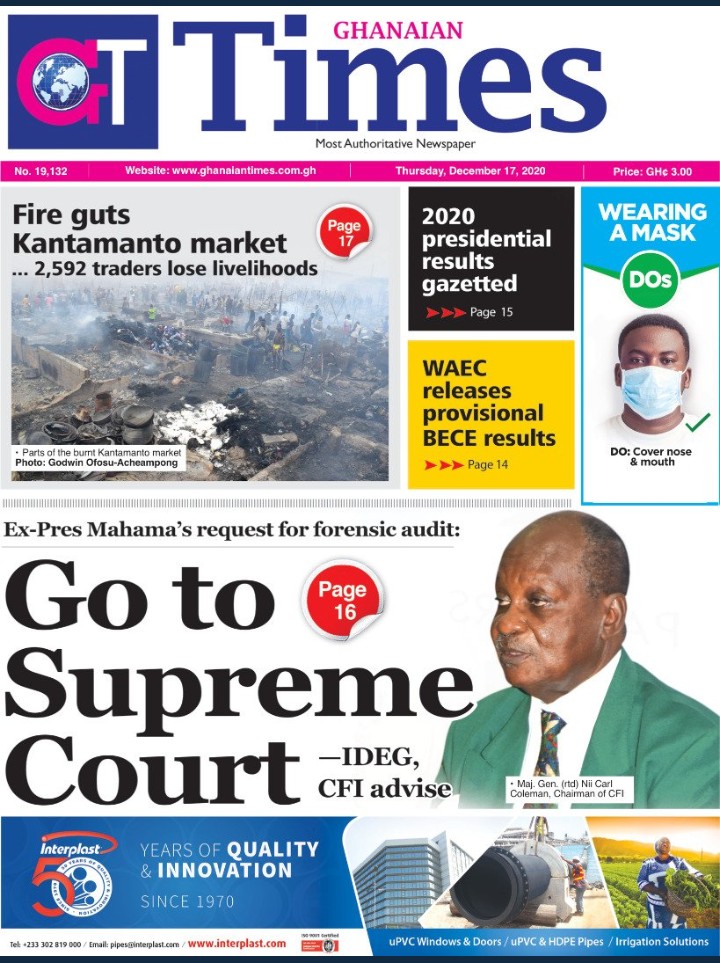 Newspapers Newspaper Headlines: Thursday, December 17, 2020 By: Editor Date: December 17, 2020 Newspaper Headlines: Thursday, December 17, 2020 TagsNewspaper HeadlinesNewspapers Previous articleNewspaper Headlines: Wednesday, December 16, 2020Next articleNAM 1’s trial adjourned to Jan. 20, 2021 Editor Share post: FacebookTwitterPinterestWhatsApp SubscribeI want inI've read and accept the Privacy Policy. Popular Former Senegalese president joins UN Secretary-General contest. The Israeli army issued new evacuation advisories in Lebanon. Ketu South: NDC Youth organiser to contest constituency chairmanship position Stakeholders back calls for regulation of political party financing, monetisation President Mahama holds bilateral meeting with Tanzanian counterpart Western Region NRSA intensifies campaign on road safety Editor - March 4, 2026 The Western Regional Office of the National Road Safety... Three factions in Nkwanta South hold peace dialogue Editor - March 4, 2026 The National Peace Council has organised a dialogue meeting... Get involved in local governance to improve development and accountability – Mr Awal Editor - March 4, 2026 Mr Mohammed Awal, the Project Lead of Ghana Centre... Ketu South: NDC Youth organiser to contest constituency chairmanship position Editor - March 4, 2026 Mr Elolo White Kelie, the former youth Organiser of... More like thisRelated