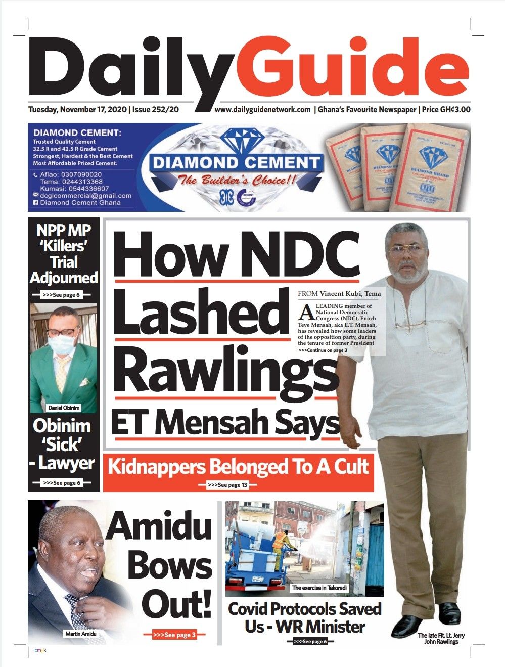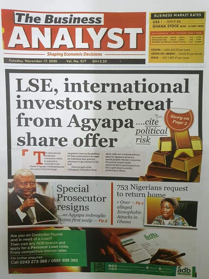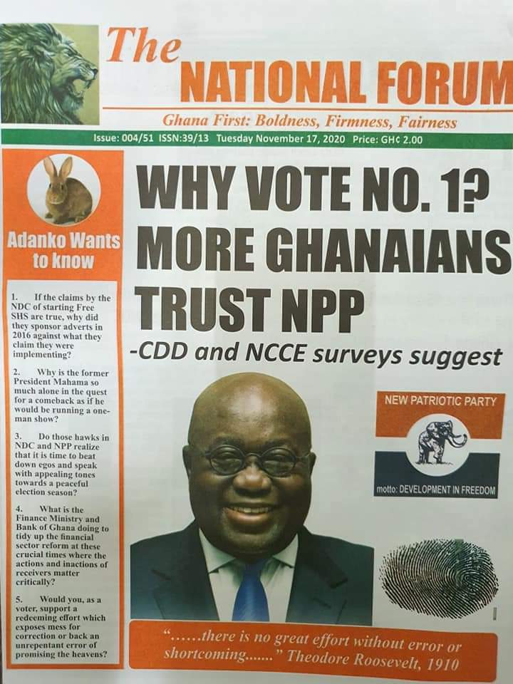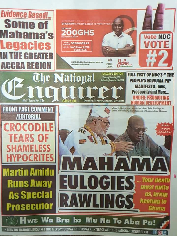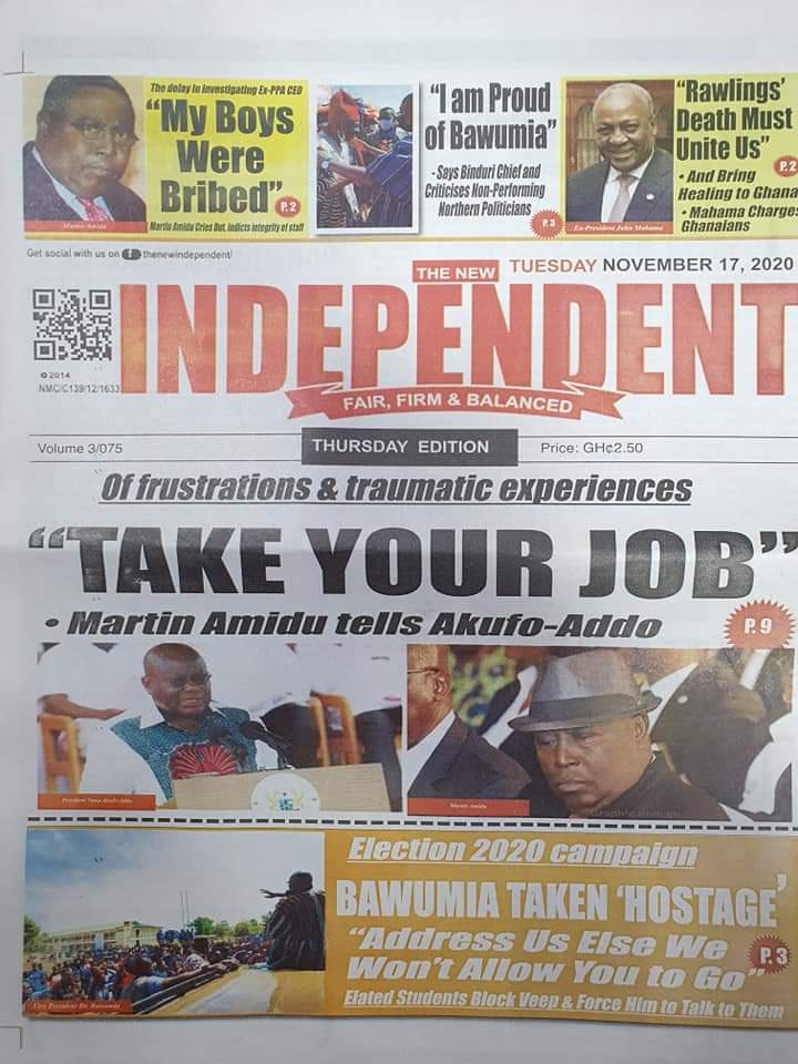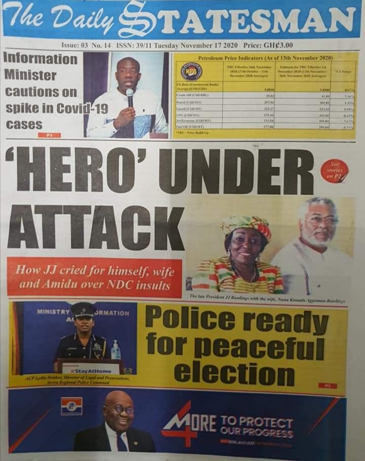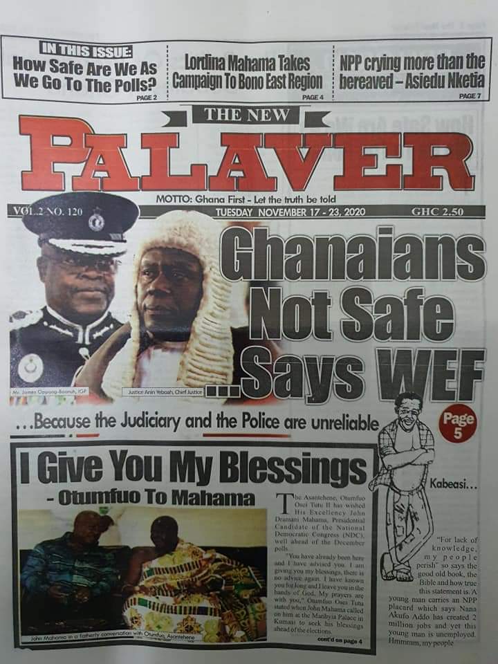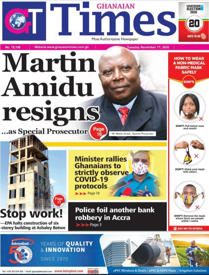 Newspapers Newspaper Headlines Tuesday 17th November 2020 By: Editor Date: November 17, 2020 Newspaper Headlines Tuesday 17th November 2020 TagsNewspaper HeadlinesNewspapers Previous articleBarcelona plan January transfer for Chelsea man ousted by LampardNext articleGhNCDA launches Situational Analysis Report on NCDs Editor Share post: FacebookTwitterPinterestWhatsApp SubscribeI want inI've read and accept the Privacy Policy. Popular Centre-Right Legacy: Empowering Ghanaians through economic freedom – Afenyo-Markin GCB Bank reaffirms commitment to Ghana–China economic ties President Mahama holds bilateral meeting with Tanzanian counterpart Former Senegalese president joins UN Secretary-General contest. Research gap hindering horticulture growth – Stakeholders  Western Region NRSA intensifies campaign on road safety Editor - March 4, 2026 The Western Regional Office of the National Road Safety... Three factions in Nkwanta South hold peace dialogue Editor - March 4, 2026 The National Peace Council has organised a dialogue meeting... Get involved in local governance to improve development and accountability – Mr Awal Editor - March 4, 2026 Mr Mohammed Awal, the Project Lead of Ghana Centre... Ketu South: NDC Youth organiser to contest constituency chairmanship position Editor - March 4, 2026 Mr Elolo White Kelie, the former youth Organiser of... More like thisRelated
