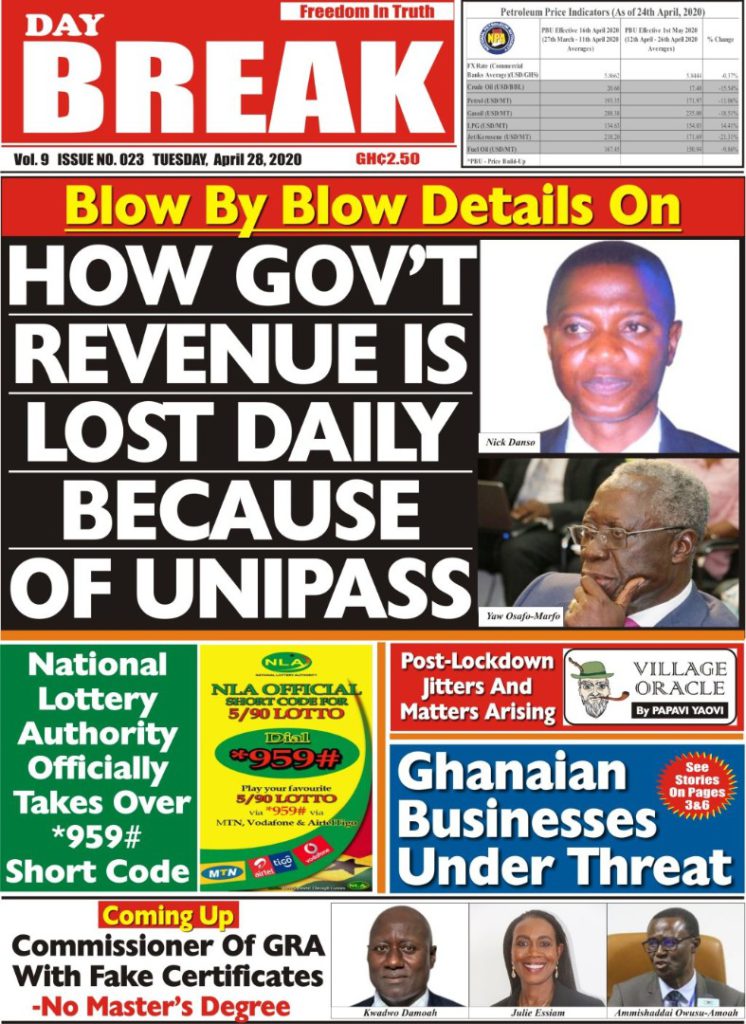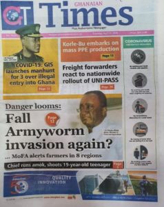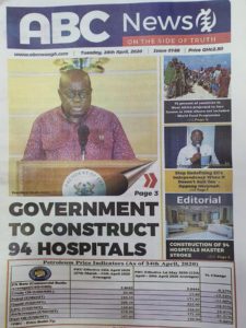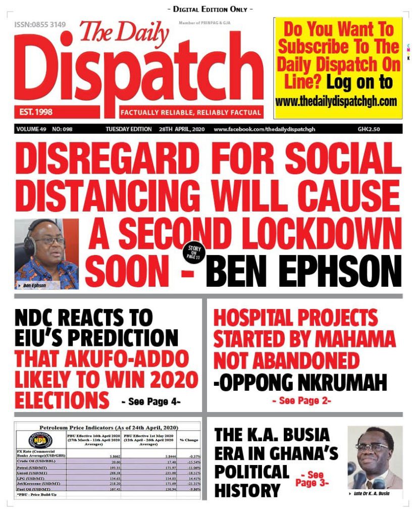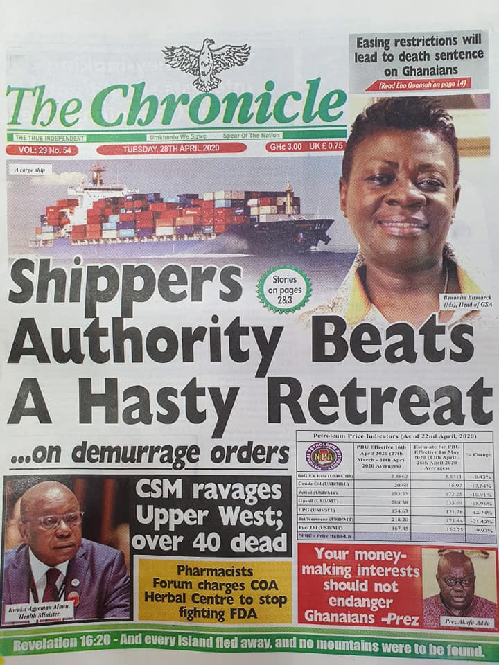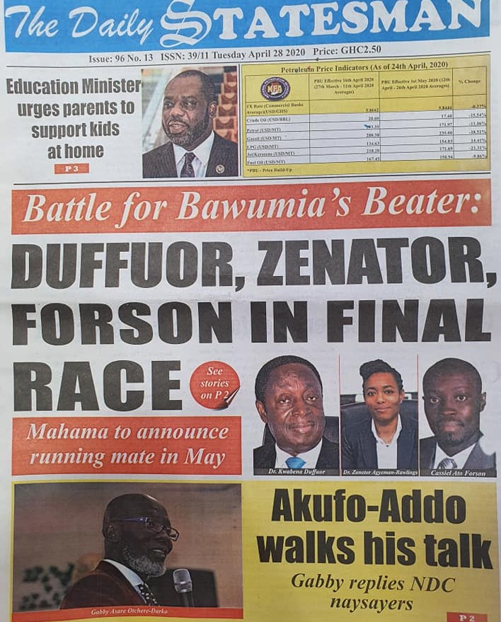 Newspapers Newspaper Headlines Tuesday 28th April 2020 By: Editor Date: April 28, 2020 Newspaper Headlines Tuesday 28th April 2020 TagsNewspaper HeadlinesNewspaper Headlines Tuesday 28th April 2020 Previous articleAMA prepares ahead of rainy seasonNext articleNewspaper Headlines Wednesday 29th April 2020 Editor Share post: FacebookTwitterPinterestWhatsApp SubscribeI want inI've read and accept the Privacy Policy. Popular Oil prices jump as Iran threatens to strike ships in the Strait of Hormuz. Stakeholders back calls for regulation of political party financing, monetisation Demand for Black Stars Jerseys rises ahead of 2026 World Cup Govt’t announces expiration of DDEP-induced restrictions on domestic bond issuance Government reviews decentralisation reforms, commits to local development Western Region NRSA intensifies campaign on road safety Editor - March 4, 2026 The Western Regional Office of the National Road Safety... Three factions in Nkwanta South hold peace dialogue Editor - March 4, 2026 The National Peace Council has organised a dialogue meeting... Get involved in local governance to improve development and accountability – Mr Awal Editor - March 4, 2026 Mr Mohammed Awal, the Project Lead of Ghana Centre... Ketu South: NDC Youth organiser to contest constituency chairmanship position Editor - March 4, 2026 Mr Elolo White Kelie, the former youth Organiser of... More like thisRelated