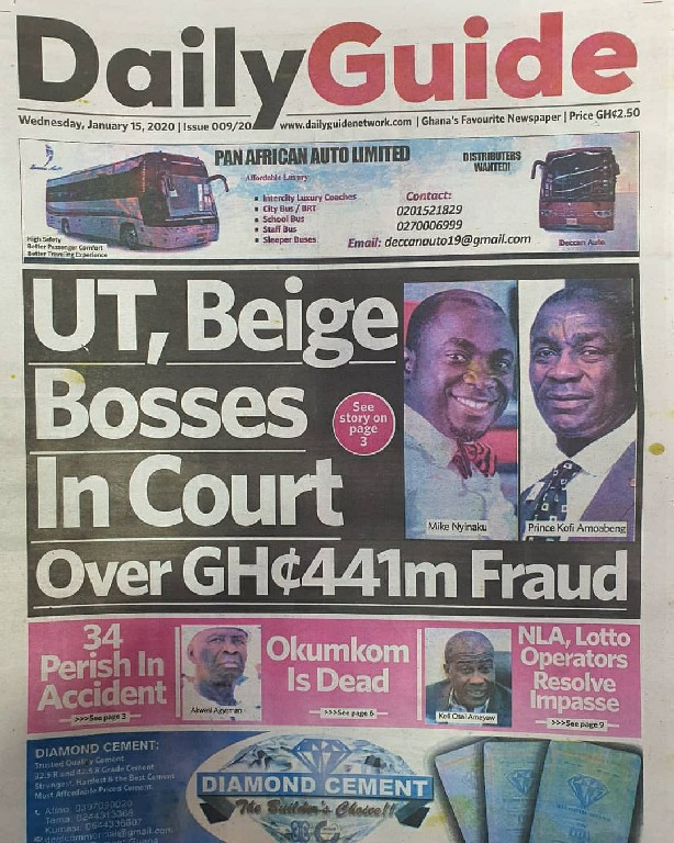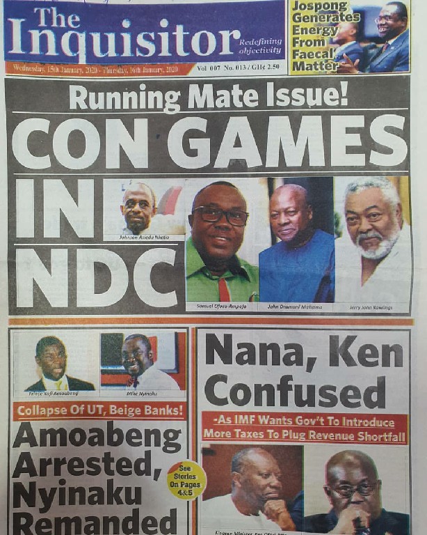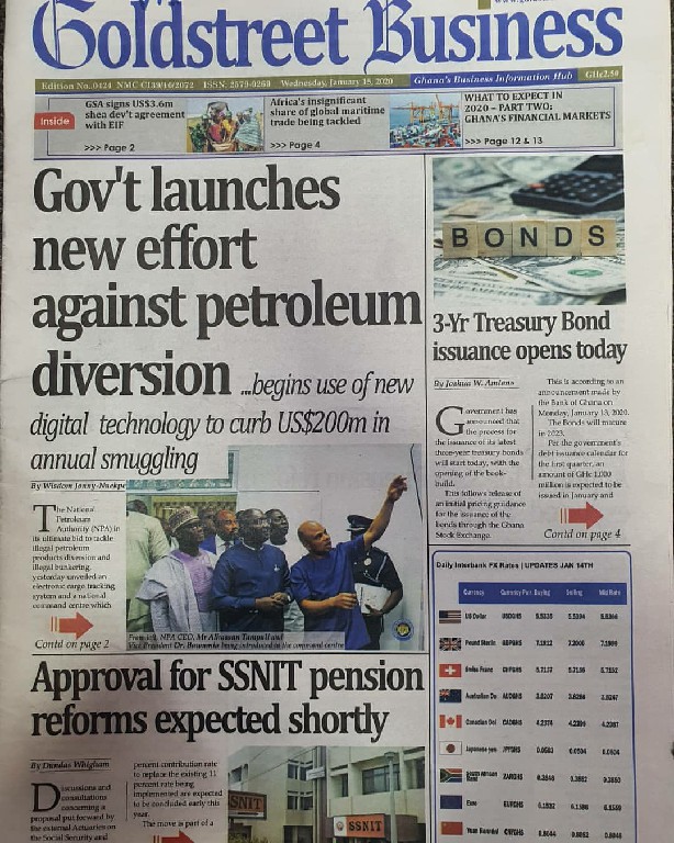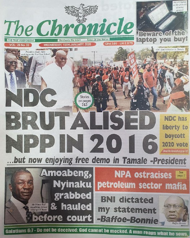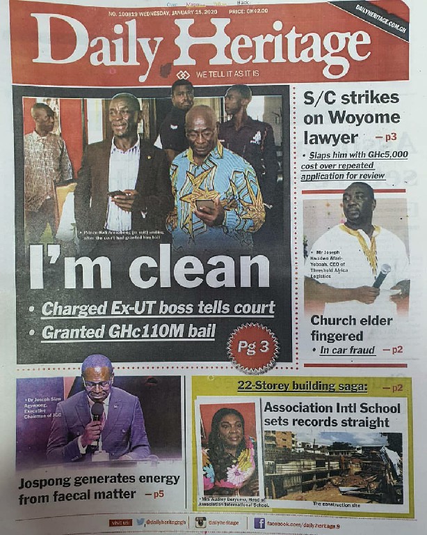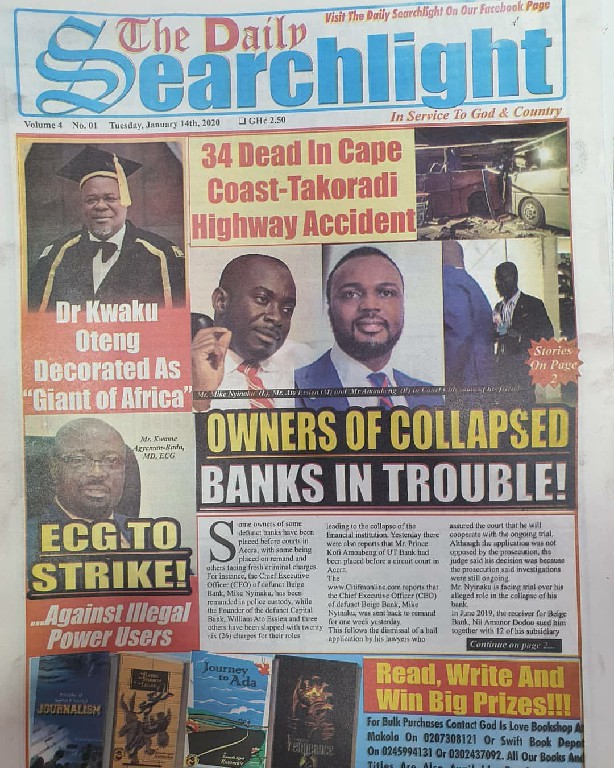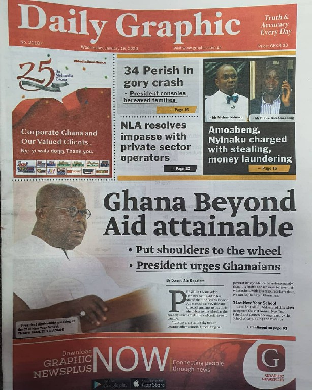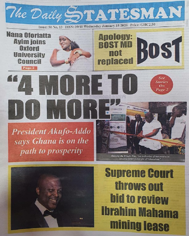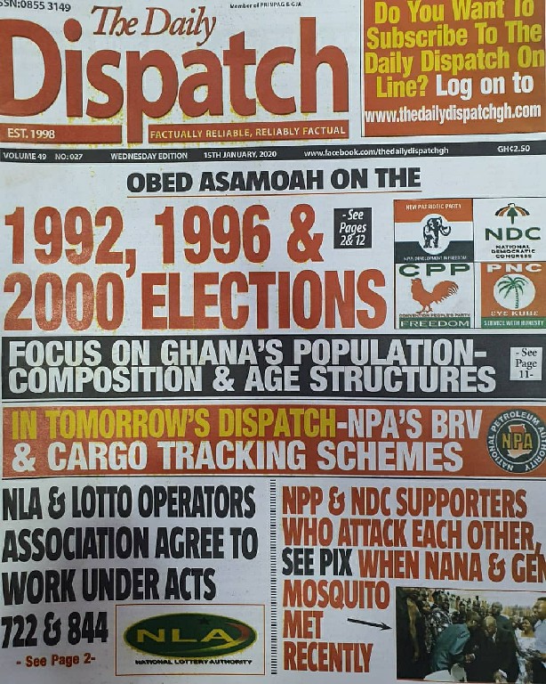 Newspapers Newspaper Headlines Wednesday 15th January 2020 By: Editor Date: January 15, 2020 Newspaper Headlines Wednesday 15th January 2020 The Publisher Daily Dispatch Daily Insight The FInder The Chronicle Ghanaian Times Daily Graphic The Inquisitor The Crusading Guide Daily Statesman Herald Daily Searchlight Goldstreet Business Daily Guide The Custodian Daily Heritage The Ghanaian Observer Today TagsNewspaper HeadlinesNewspaper Headlines Wednesday 15th January 2020Newspapers Previous articleNewspaper Headlines Tuesday 14th January 2020Next article34 perish and 54 sustain injuries Editor Share post: FacebookTwitterPinterestWhatsApp SubscribeI want inI've read and accept the Privacy Policy. Popular Manchester United midfielder set to follow Casemiro out of the club amid transfer interest from Serie A. Economist calls for resources to push 24-hour economy implementation Ketu South: NDC Youth organiser to contest constituency chairmanship position Venture Capital Trust Fund transforms mattress company with Ghc4.5m Get involved in local governance to improve development and accountability – Mr Awal Western Region NRSA intensifies campaign on road safety Editor - March 4, 2026 The Western Regional Office of the National Road Safety... Three factions in Nkwanta South hold peace dialogue Editor - March 4, 2026 The National Peace Council has organised a dialogue meeting... Get involved in local governance to improve development and accountability – Mr Awal Editor - March 4, 2026 Mr Mohammed Awal, the Project Lead of Ghana Centre... Ketu South: NDC Youth organiser to contest constituency chairmanship position Editor - March 4, 2026 Mr Elolo White Kelie, the former youth Organiser of... More like thisRelated