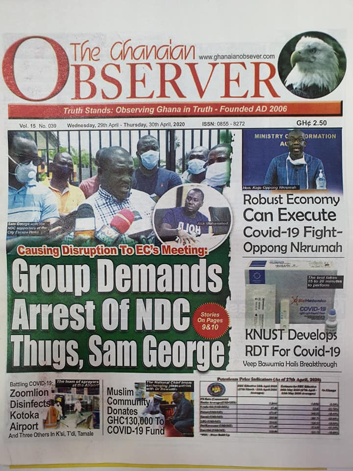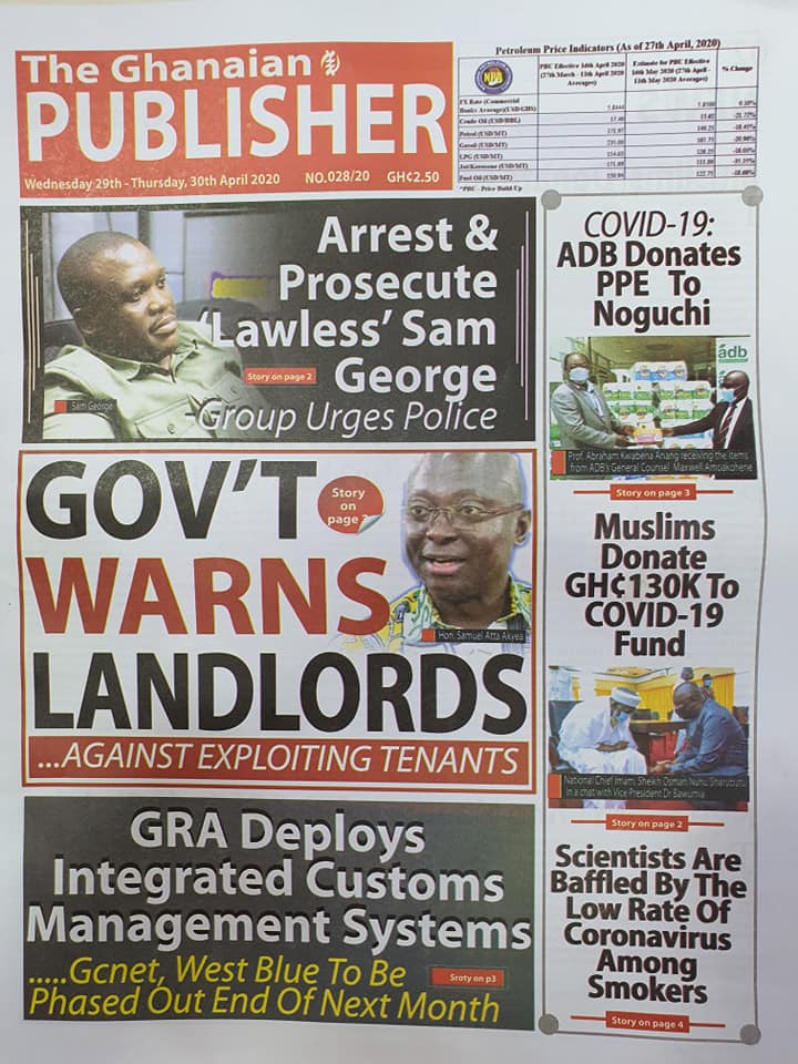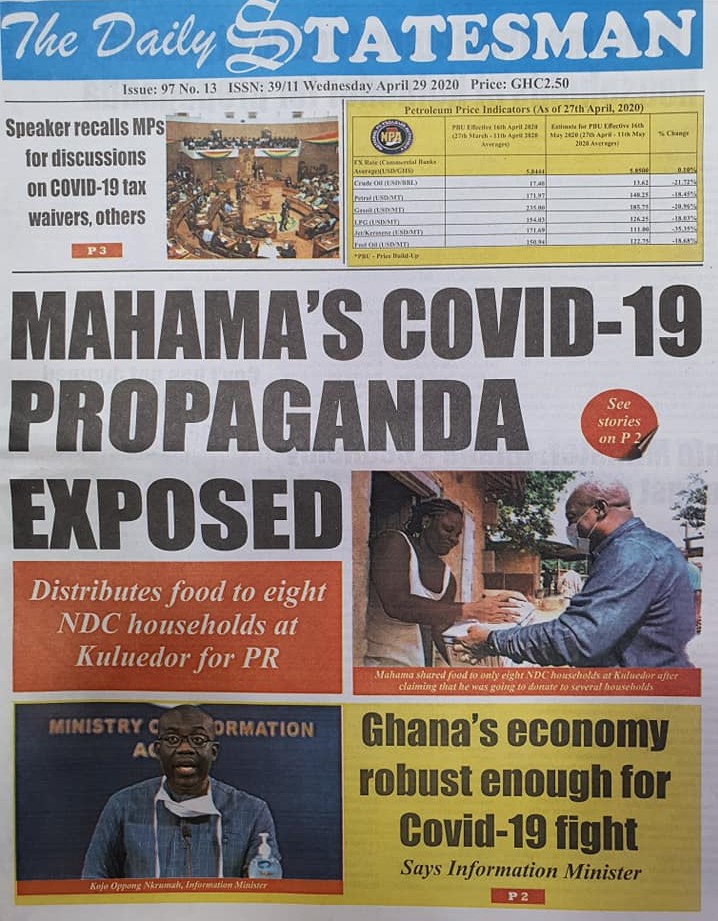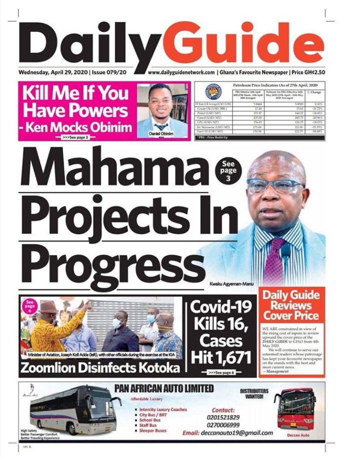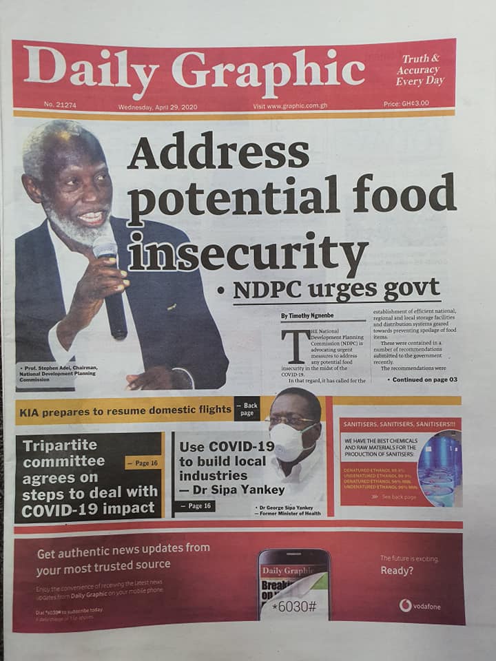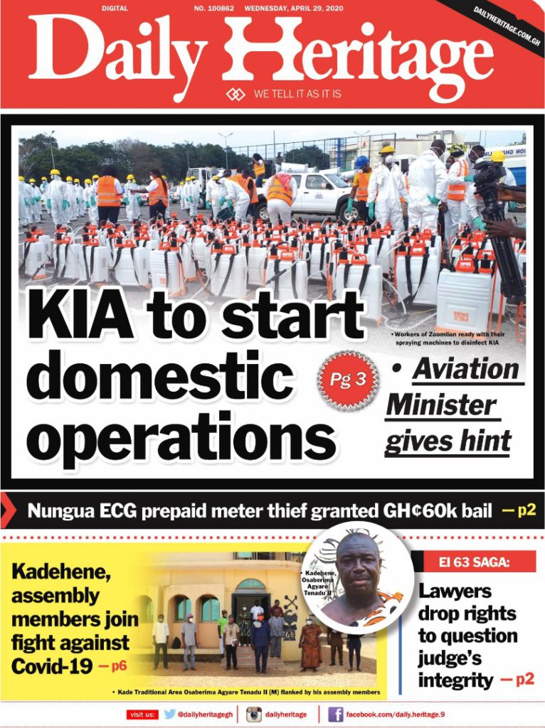 Newspapers Newspaper Headlines Wednesday 29th April 2020 By: Editor Date: April 29, 2020 Newspaper Headlines Wednesday 29th April 2020 TagsNewspaper HeadlinesNewspaper Headlines Wednesday 29th April 2020 Previous articleNewspaper Headlines Tuesday 28th April 2020Next articleNewspaper Headlines Thursday 30th April 2020 Editor Share post: FacebookTwitterPinterestWhatsApp SubscribeI want inI've read and accept the Privacy Policy. Popular Ketu South: NDC Youth organiser to contest constituency chairmanship position Portugal captain Ronaldo sent an ominous seven-word warning by Colombia icon ahead of the 2026 World Cup encounter. 2026 SoNA projects economic stability-Political Analyst Economist calls for resources to push 24-hour economy implementation The United States slaps sanctions on Rwanda’s military over violence in the Democratic Republic of Congo. Western Region NRSA intensifies campaign on road safety Editor - March 4, 2026 The Western Regional Office of the National Road Safety... Three factions in Nkwanta South hold peace dialogue Editor - March 4, 2026 The National Peace Council has organised a dialogue meeting... Get involved in local governance to improve development and accountability – Mr Awal Editor - March 4, 2026 Mr Mohammed Awal, the Project Lead of Ghana Centre... Ketu South: NDC Youth organiser to contest constituency chairmanship position Editor - March 4, 2026 Mr Elolo White Kelie, the former youth Organiser of... More like thisRelated