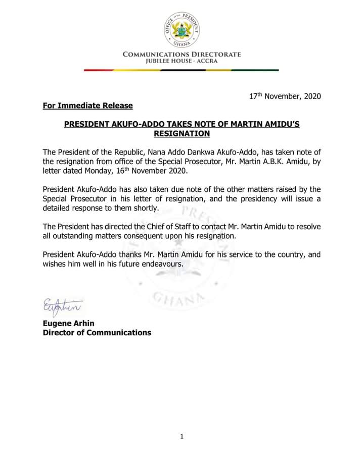 President Nana Addo Dankwa Akufo-Addo has today, Tuesday, November 17, 2020, accepted the resignation of Mr. Martin Amidu as the Special Prosecutor.