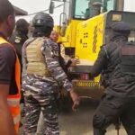 The retailers pelted stones at the bulldozer being used for the exercise, breaking its windscreen, amidst gunshots.