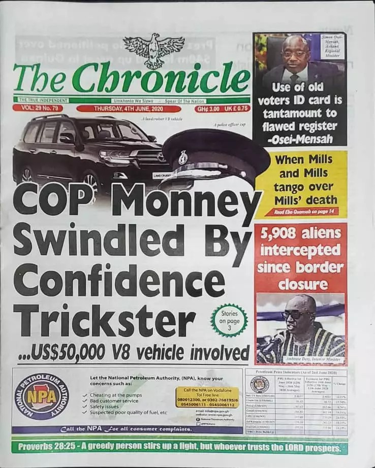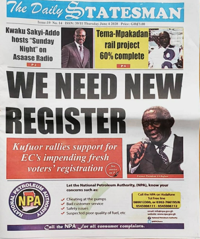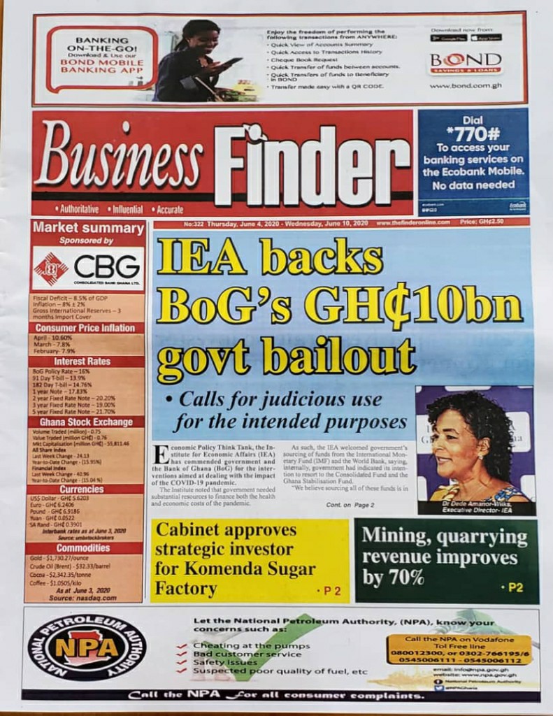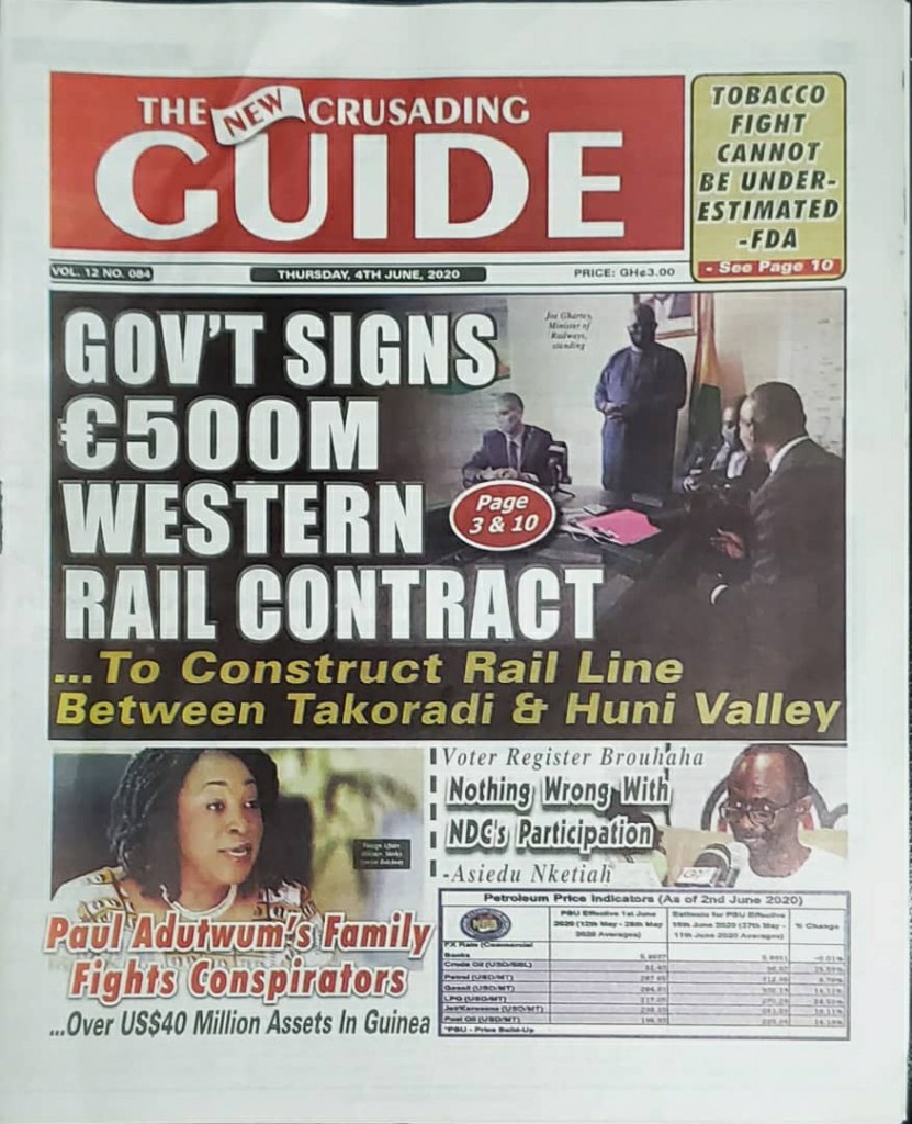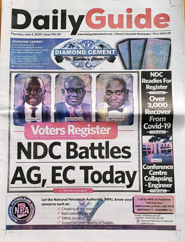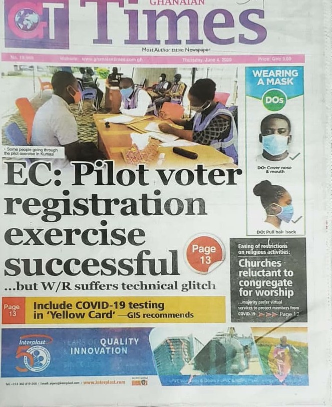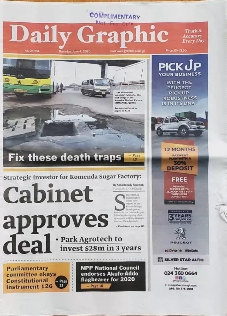Newspapers Thursday 4th June 2020 By: Editor Date: June 4, 2020 Thursday 4th June 2020 TagsNewspaper HeadlinesNewspapersThursday 4th June 2020 Previous articleAfrican equity capital markets activity see downward turn, but increase in domestic investors – Making Finance Work for Africa partnership and PricewaterhouseCoopers (PwC) NigeriaNext articleOver 127 journalists die from COVID-19 globally: PEC Editor Share post: FacebookTwitterPinterestWhatsApp SubscribeI want inI've read and accept the Privacy Policy. Popular Centre-Right Legacy: Empowering Ghanaians through economic freedom – Afenyo-Markin Venture Capital Trust Fund transforms mattress company with Ghc4.5m 2026 SoNA projects economic stability-Political Analyst Ketu South: NDC Youth organiser to contest constituency chairmanship position Pep Guardiola provides an updated report on Erling Haaland’s injury as Manchester City awaits the star striker’s fitness for the Nottingham Forest match. Western Region NRSA intensifies campaign on road safety Editor - March 4, 2026 The Western Regional Office of the National Road Safety... Three factions in Nkwanta South hold peace dialogue Editor - March 4, 2026 The National Peace Council has organised a dialogue meeting... Get involved in local governance to improve development and accountability – Mr Awal Editor - March 4, 2026 Mr Mohammed Awal, the Project Lead of Ghana Centre... Ketu South: NDC Youth organiser to contest constituency chairmanship position Editor - March 4, 2026 Mr Elolo White Kelie, the former youth Organiser of... More like thisRelated