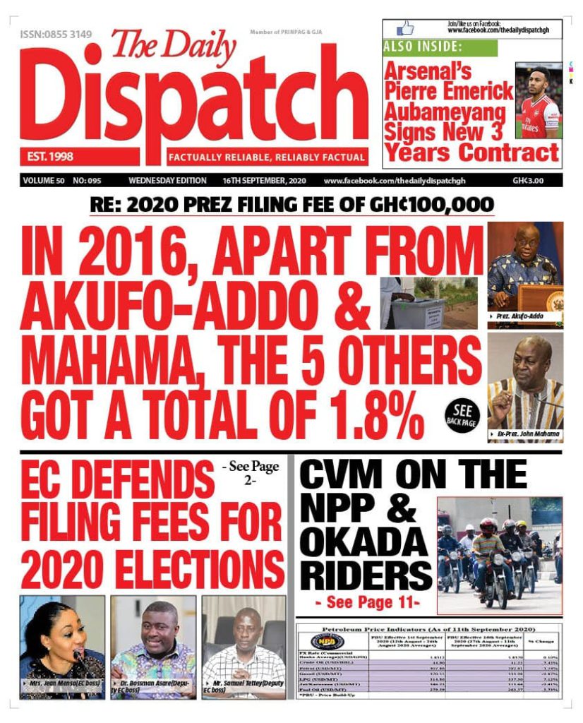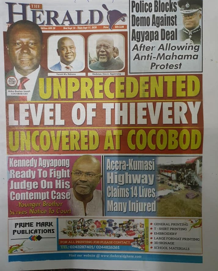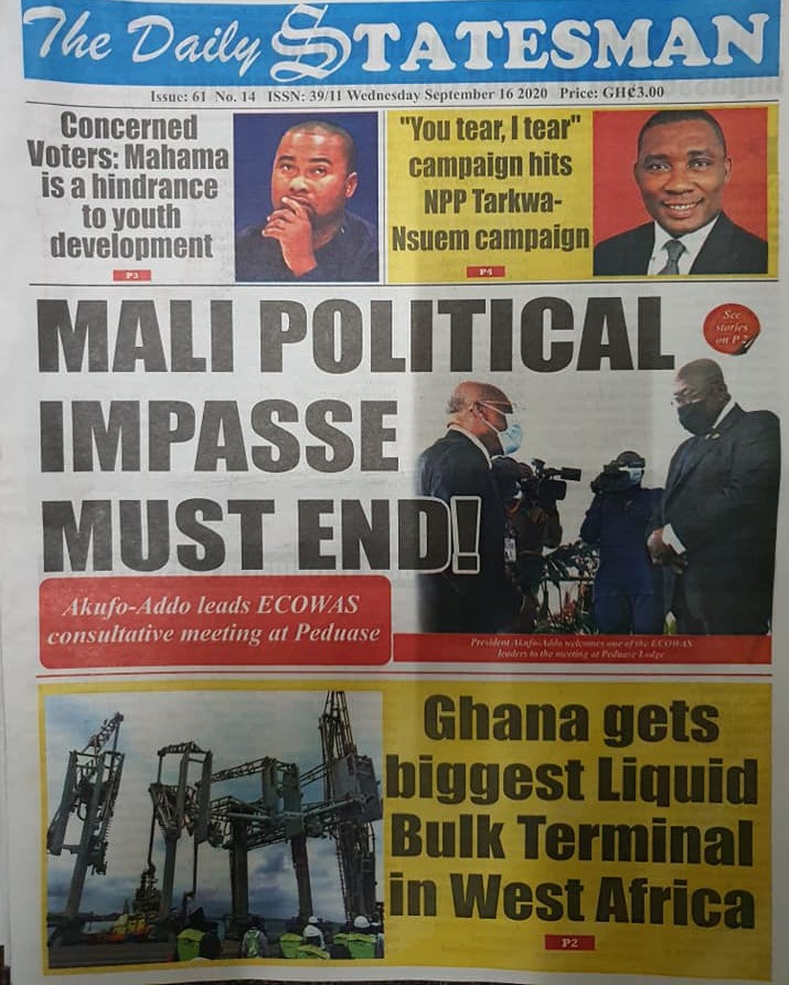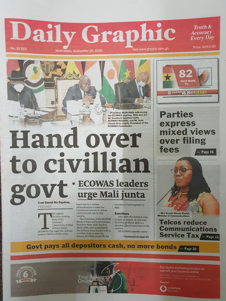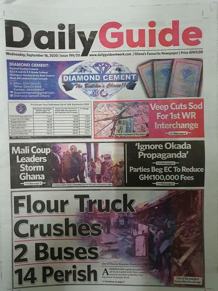 Newspapers Wednesday 16th September 2020 By: Editor Date: September 16, 2020 Wednesday 16th September 2020 TagsNewspaper HeadlinesNewspapers Previous articleMary Kay Named Among Top Brands in the Purpose Power Indexâ„¢Next articleThursday 17th September 2020 Editor Share post: FacebookTwitterPinterestWhatsApp SubscribeI want inI've read and accept the Privacy Policy. Popular Demand for Black Stars Jerseys rises ahead of 2026 World Cup Trump predicts Iran conflict might take weeks; US citizens in dozens of nations are encouraged to escape. 2026 SoNA projects economic stability-Political Analyst Cavan Sullivan is expected to leave Manchester City immediately on a two-year European loan as a former USMNT great urges patience with the MLS... Centre-Right Legacy: Empowering Ghanaians through economic freedom – Afenyo-Markin Western Region NRSA intensifies campaign on road safety Editor - March 4, 2026 The Western Regional Office of the National Road Safety... Three factions in Nkwanta South hold peace dialogue Editor - March 4, 2026 The National Peace Council has organised a dialogue meeting... Get involved in local governance to improve development and accountability – Mr Awal Editor - March 4, 2026 Mr Mohammed Awal, the Project Lead of Ghana Centre... Ketu South: NDC Youth organiser to contest constituency chairmanship position Editor - March 4, 2026 Mr Elolo White Kelie, the former youth Organiser of... More like thisRelated