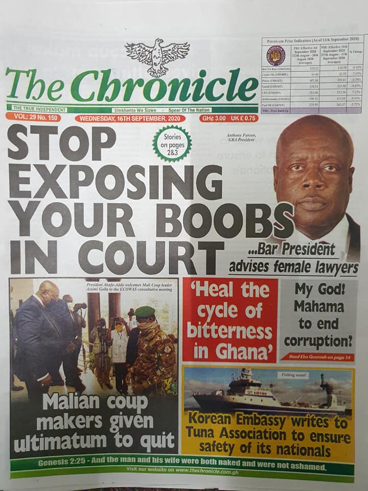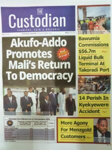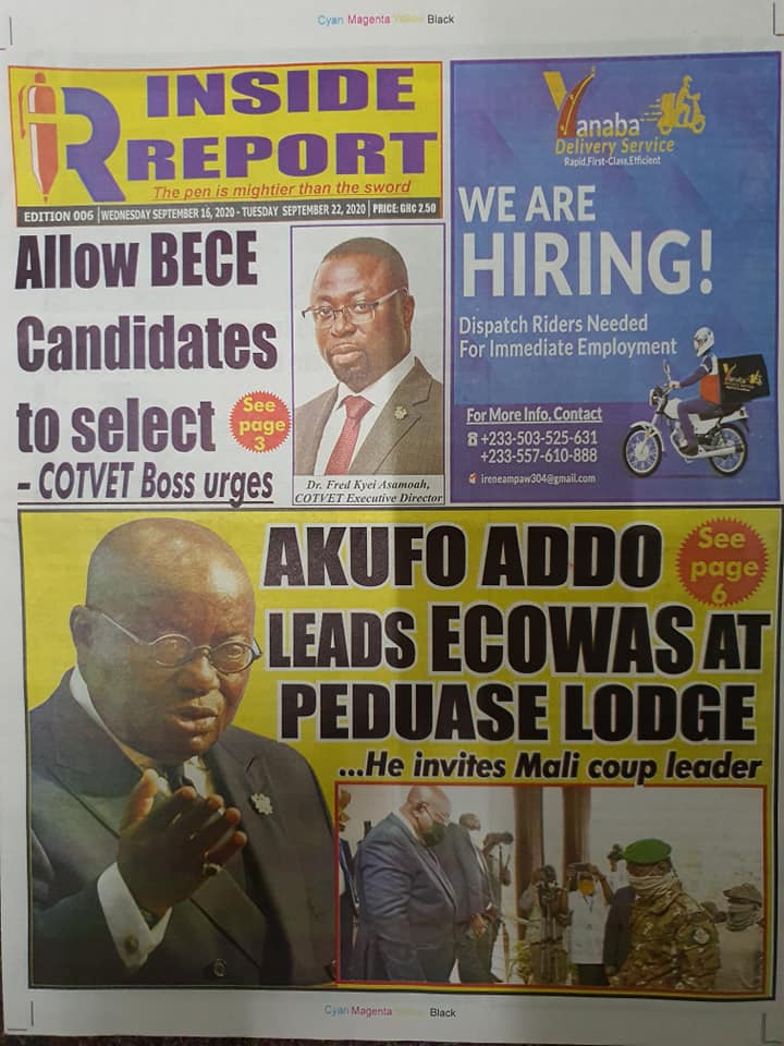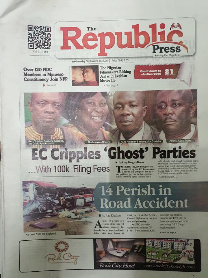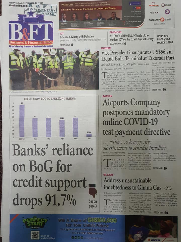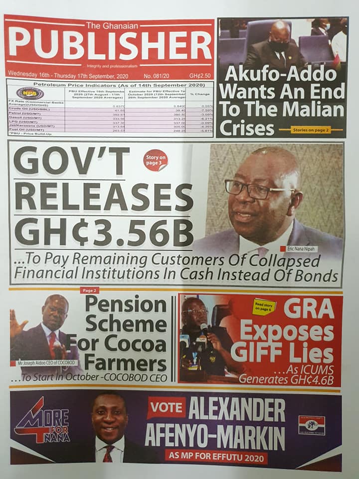 Newspapers Wednesday 16th September 2020 By: Editor Date: September 16, 2020 Wednesday 16th September 2020 TagsNewspaper HeadlinesNewspapers Previous articleMary Kay Named Among Top Brands in the Purpose Power Indexâ„¢Next articleThursday 17th September 2020 Editor Share post: FacebookTwitterPinterestWhatsApp SubscribeI want inI've read and accept the Privacy Policy. Popular Demand for Black Stars Jerseys rises ahead of 2026 World Cup Trump predicts Iran conflict might take weeks; US citizens in dozens of nations are encouraged to escape. 2026 SoNA projects economic stability-Political Analyst Cavan Sullivan is expected to leave Manchester City immediately on a two-year European loan as a former USMNT great urges patience with the MLS... Centre-Right Legacy: Empowering Ghanaians through economic freedom – Afenyo-Markin Western Region NRSA intensifies campaign on road safety Editor - March 4, 2026 The Western Regional Office of the National Road Safety... Three factions in Nkwanta South hold peace dialogue Editor - March 4, 2026 The National Peace Council has organised a dialogue meeting... Get involved in local governance to improve development and accountability – Mr Awal Editor - March 4, 2026 Mr Mohammed Awal, the Project Lead of Ghana Centre... Ketu South: NDC Youth organiser to contest constituency chairmanship position Editor - March 4, 2026 Mr Elolo White Kelie, the former youth Organiser of... More like thisRelated